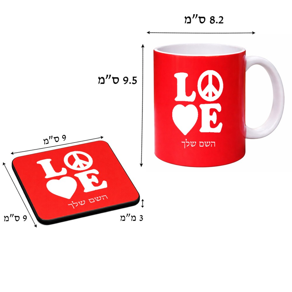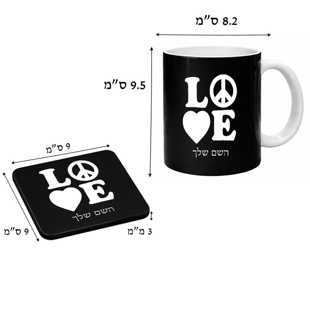 ספל תה \ קפה + תחתית מרובעת בעיצוב אישי עם השם שלך בעיצוב אהבה גודל הספל 325 מ"ל, הספל בעלת ידית לאחיזה יציבה, תחתית מעוצבת בגודל 9 × 9 ס"מ. את השם המבוקש ניתן לציין בהזמנה, אם לא צויין אנחנו ניצור קשר לבירור.