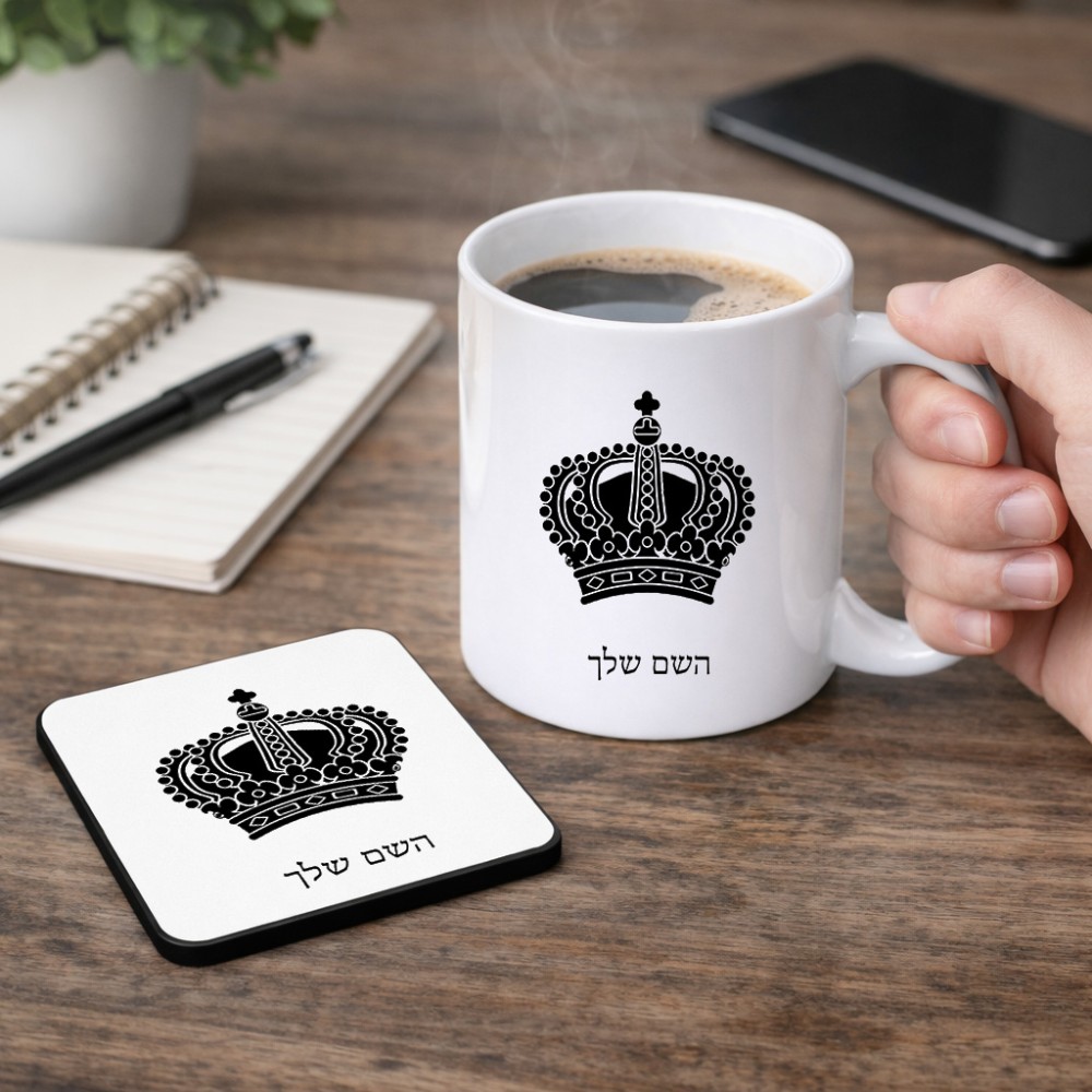 ספל תה \ קפה + תחתית מרובעת בעיצוב אישי עם השם שלך בעיצוב כתר מלכותי גודל הספל 325 מ"ל, הספל בעלת ידית לאחיזה יציבה, תחתית מעוצבת בגודל 9 × 9 ס"מ. את השם המבוקש ניתן לציין בהזמנה, אם לא צויין אנחנו ניצור קשר לבירור.