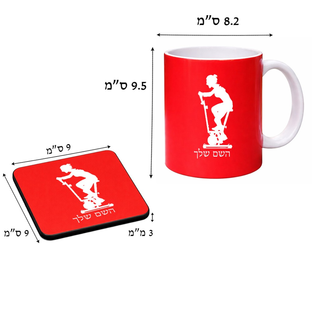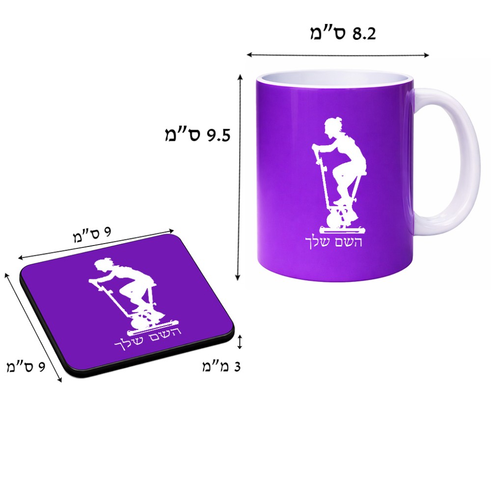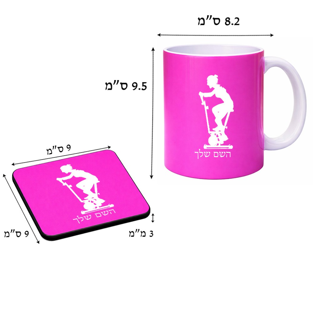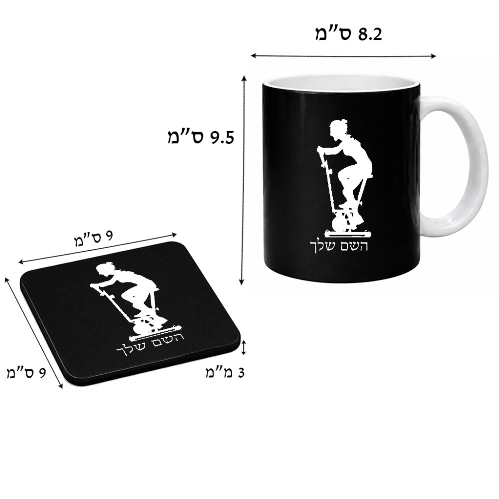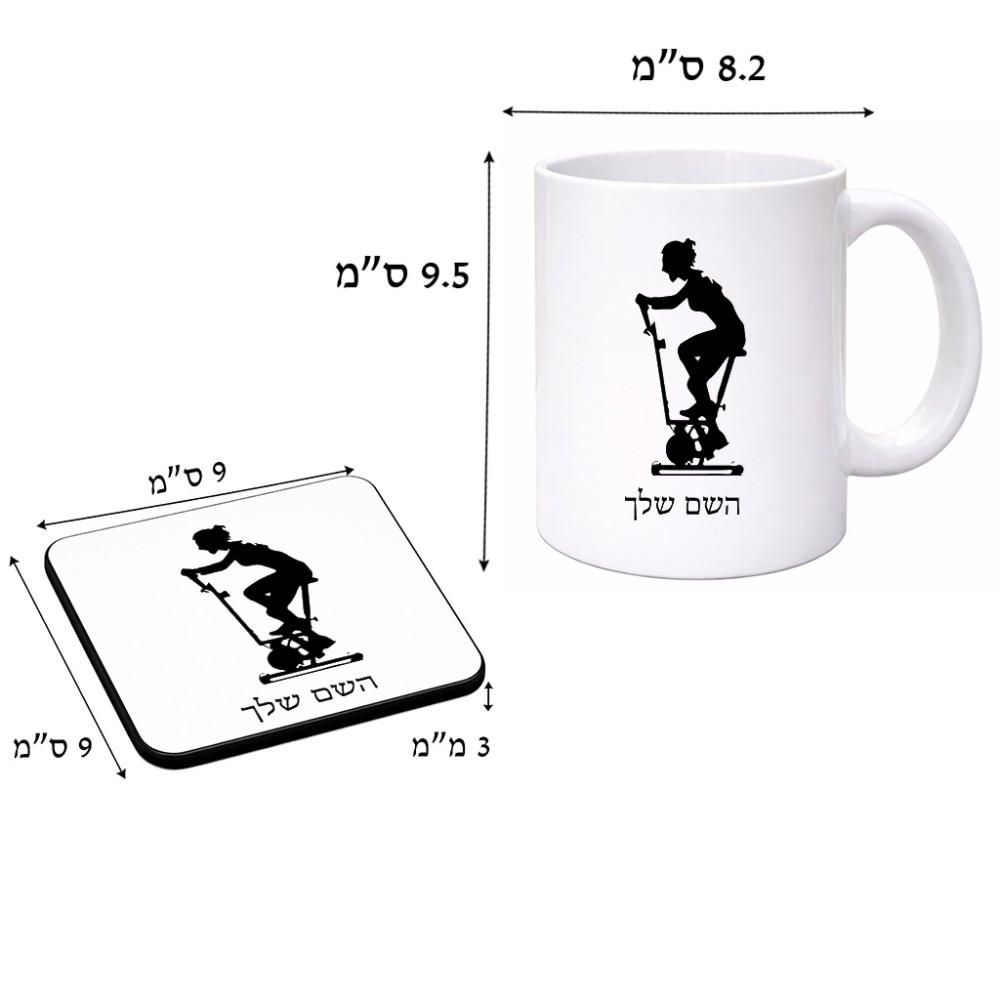 ספל תה \ קפה + תחתית מרובעת בעיצוב אישי עם השם שלך בעיצוב אימון ספינינג - אישה גודל הספל 325 מ"ל גודל התחתית 9 × 9 ס"מ