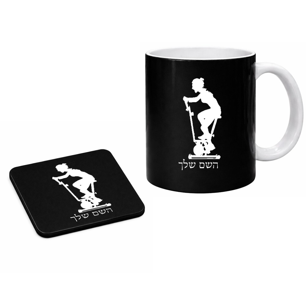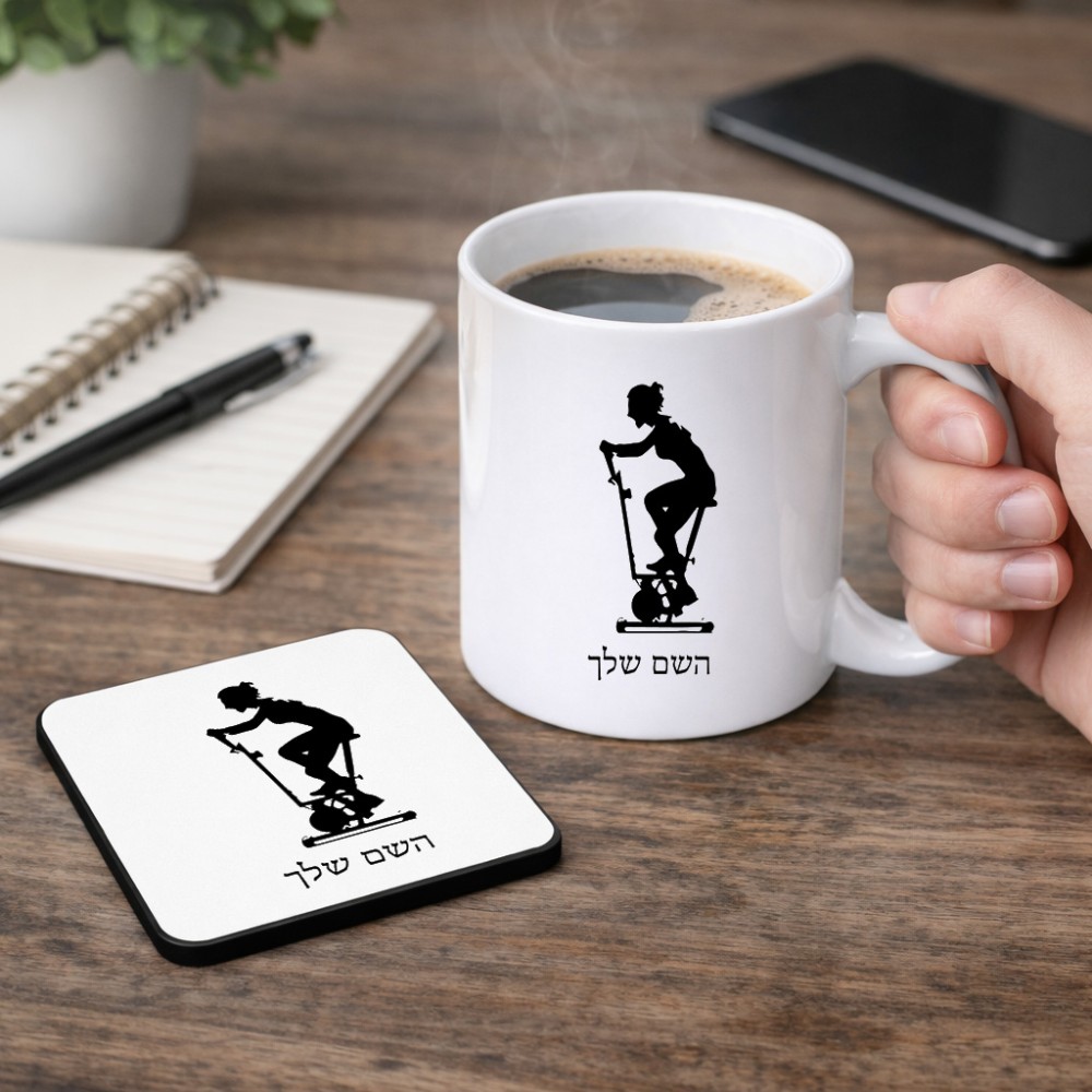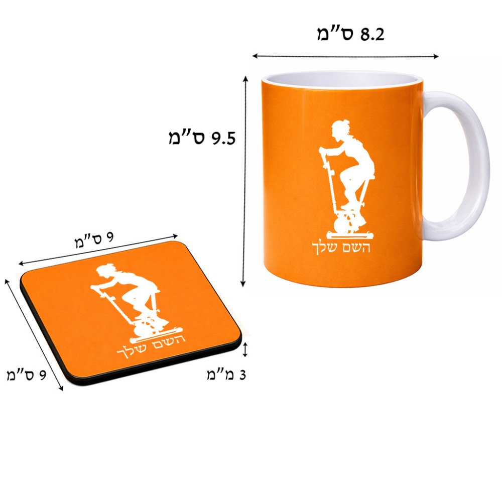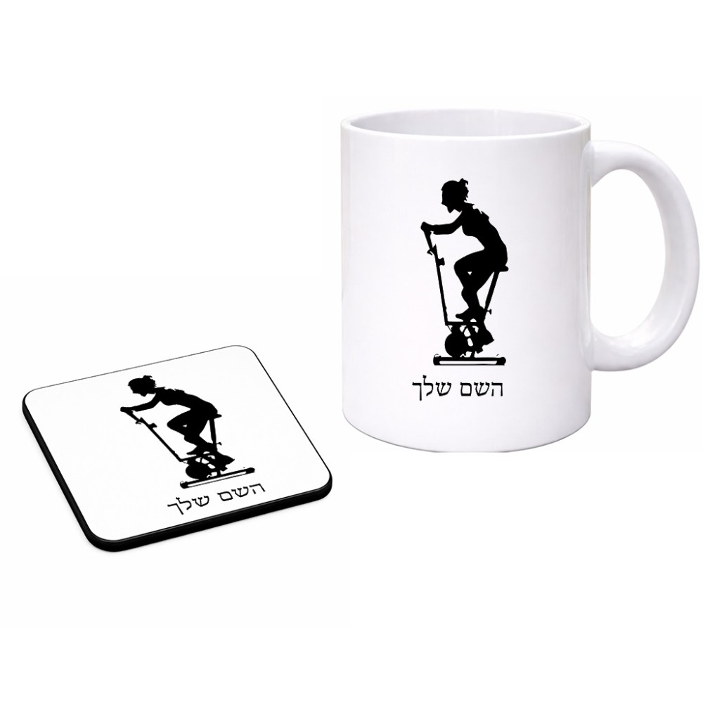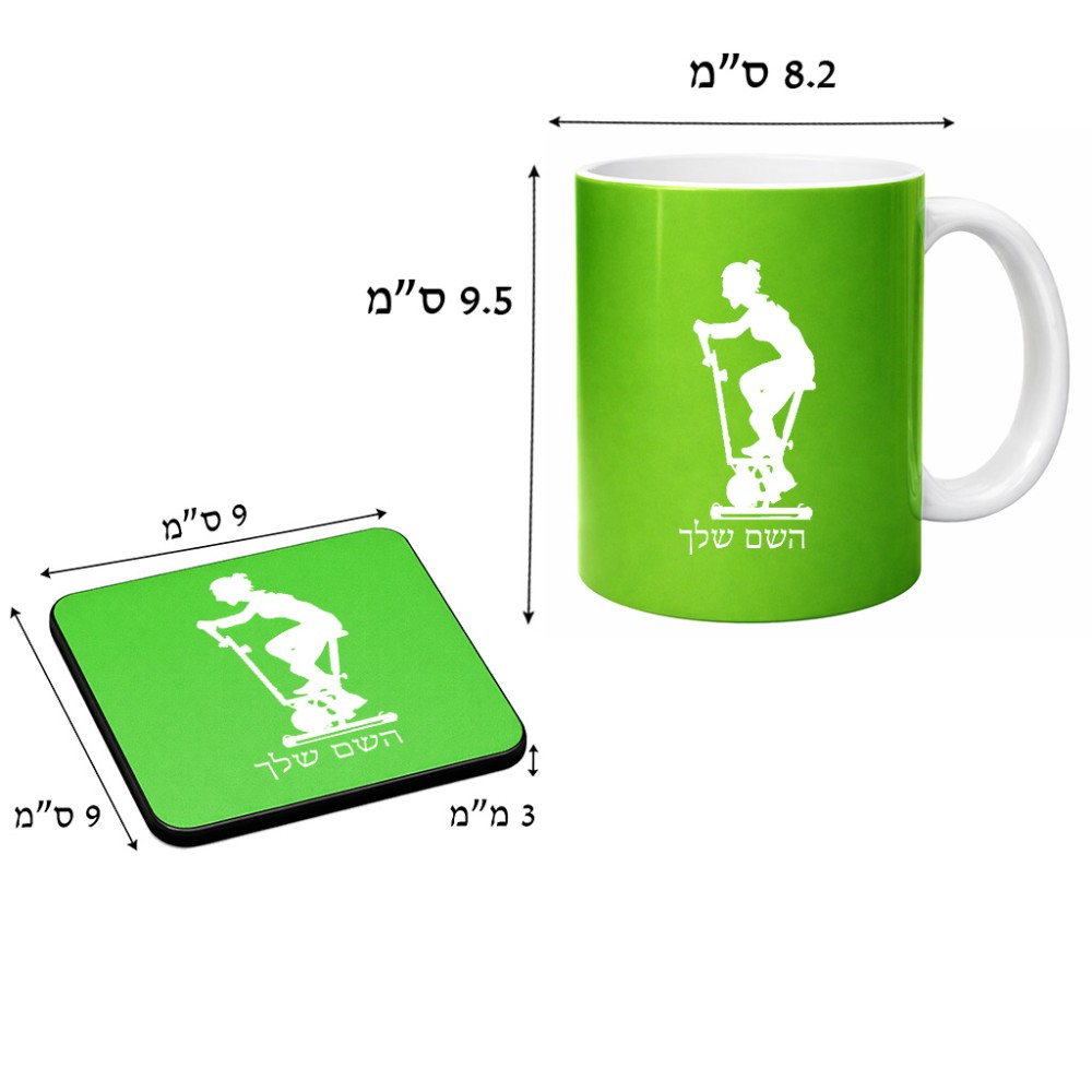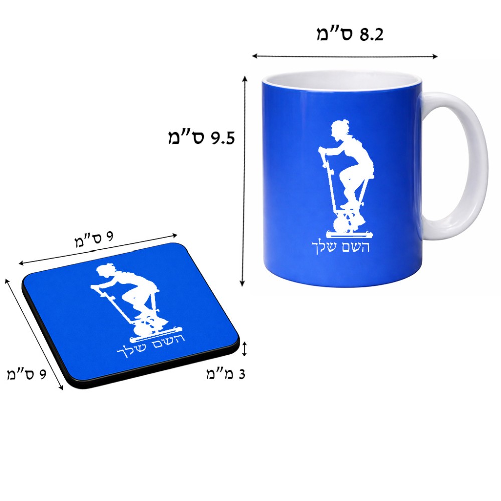 ספל תה \ קפה + תחתית מרובעת בעיצוב אישי עם השם שלך בעיצוב אימון ספינינג - אישה גודל הספל 325 מ"ל גודל התחתית 9 × 9 ס"מ