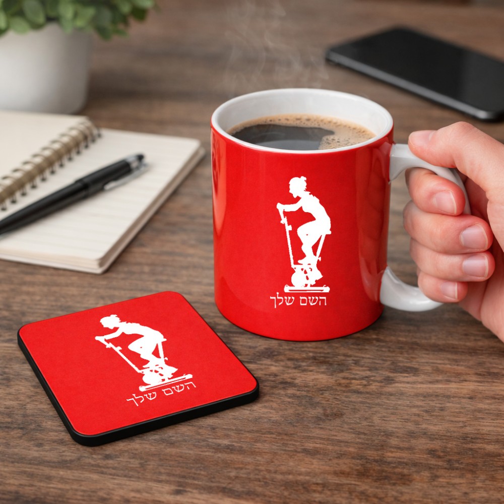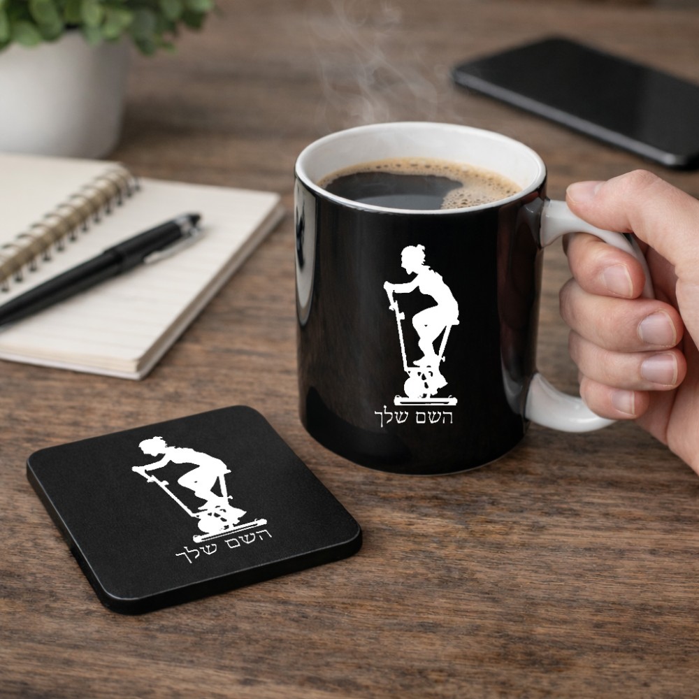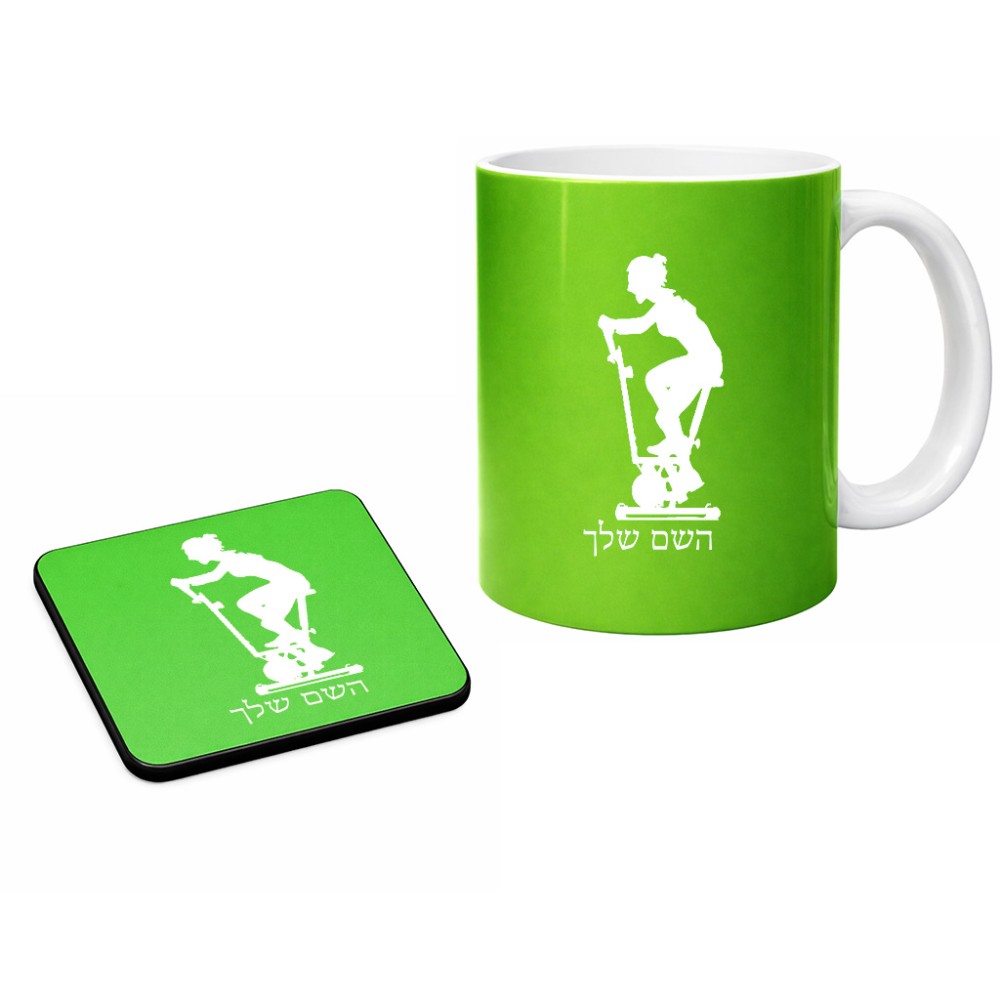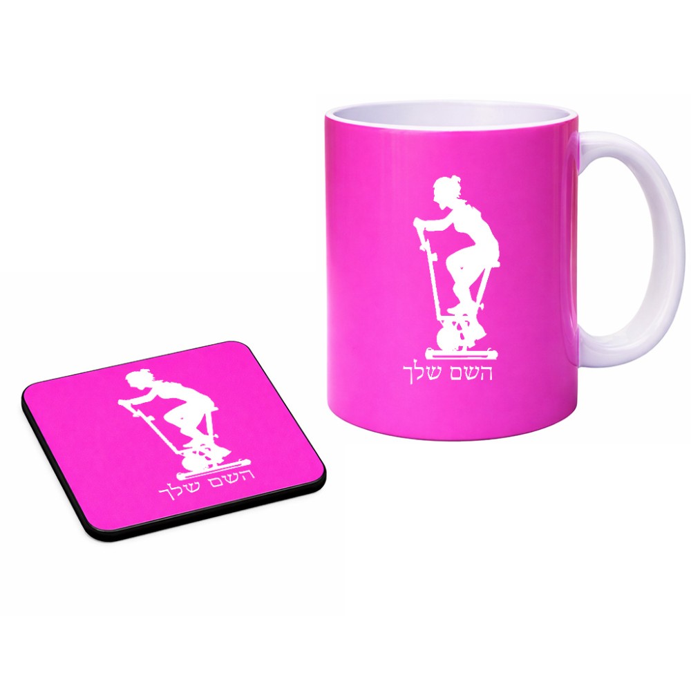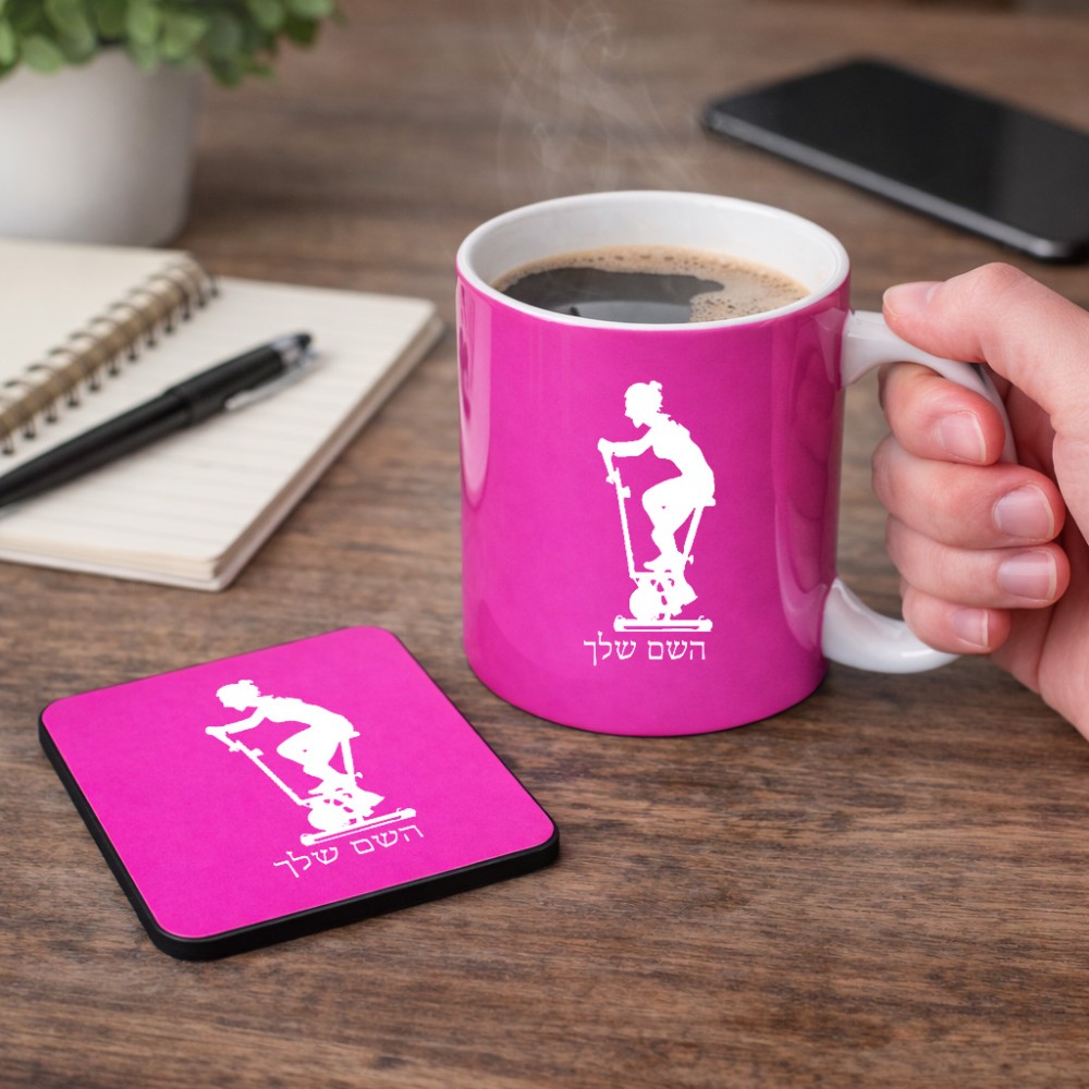ספל תה \ קפה + תחתית מרובעת בעיצוב אישי עם השם שלך בעיצוב אימון ספינינג - אישה גודל הספל 325 מ"ל גודל התחתית 9 × 9 ס"מ