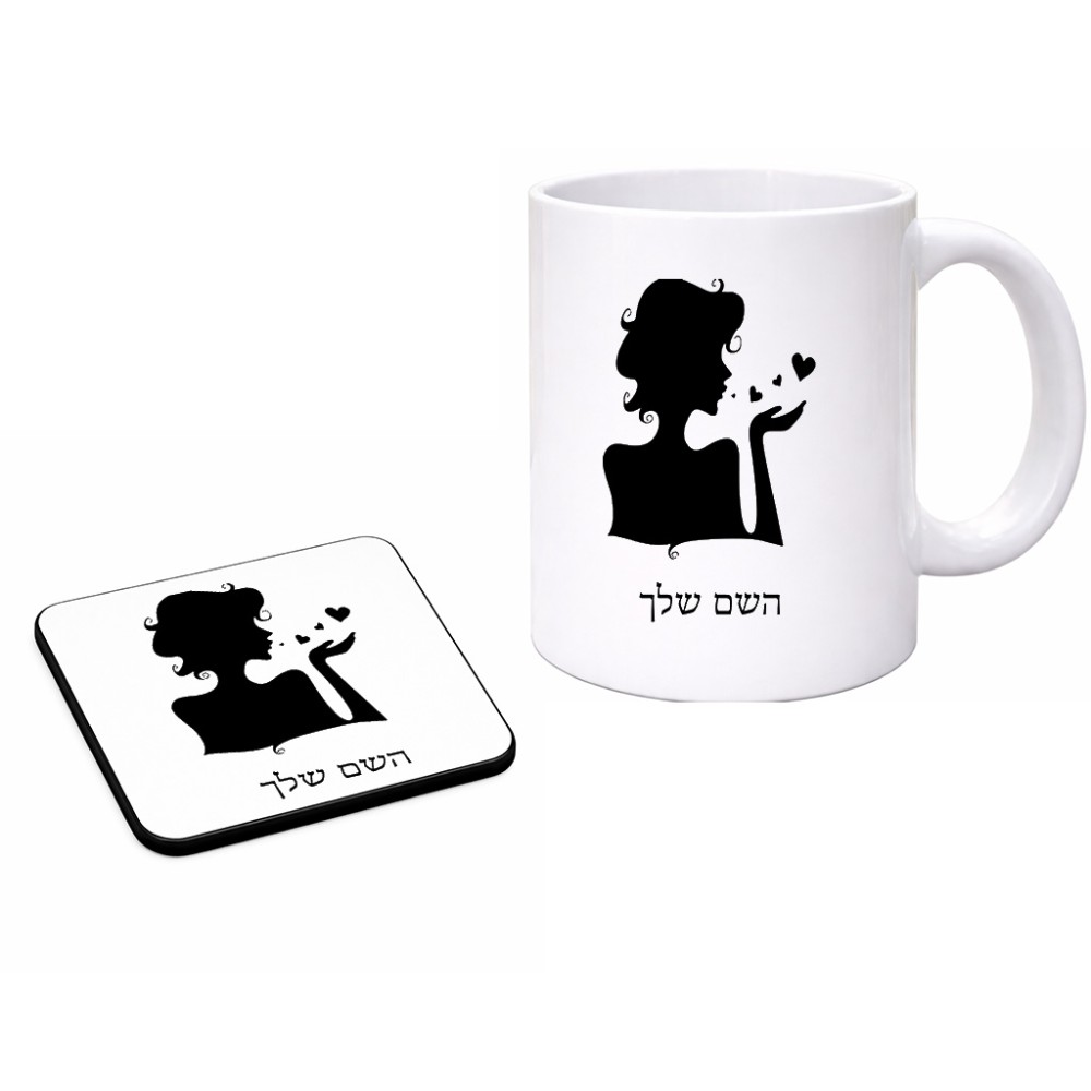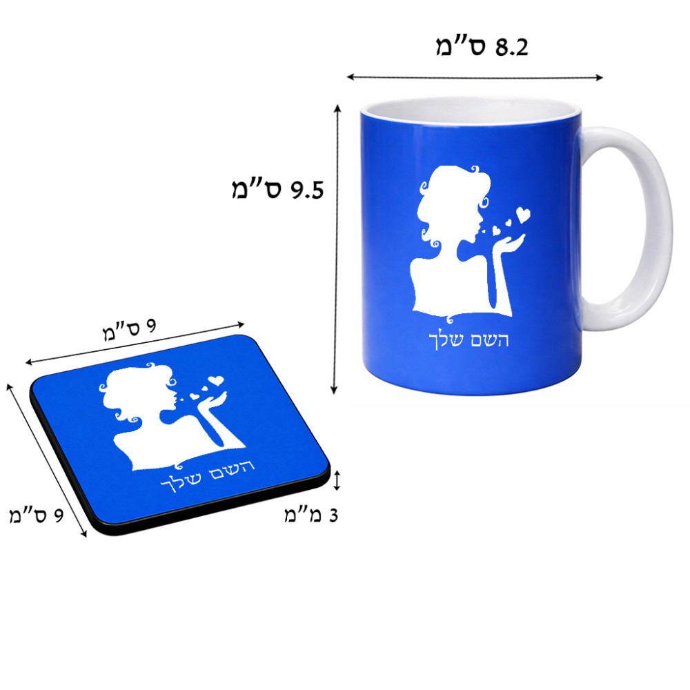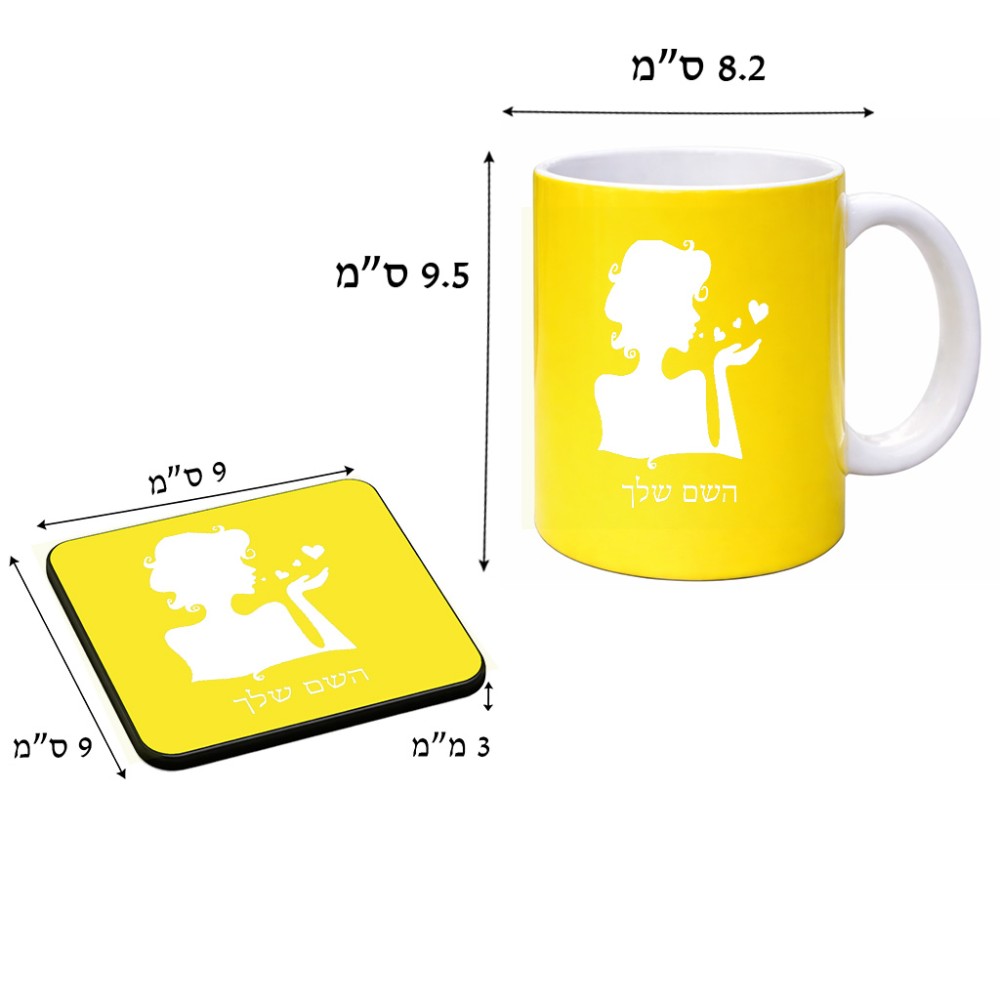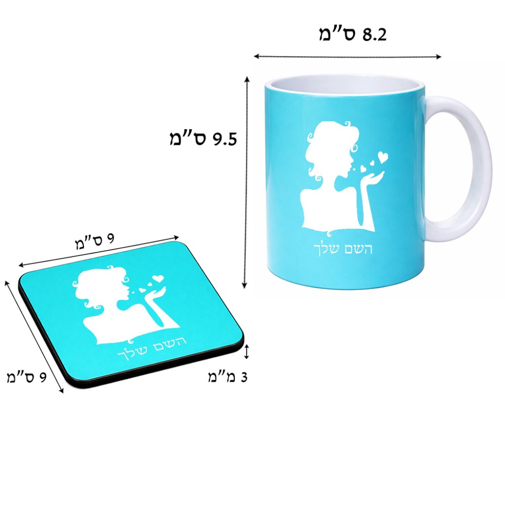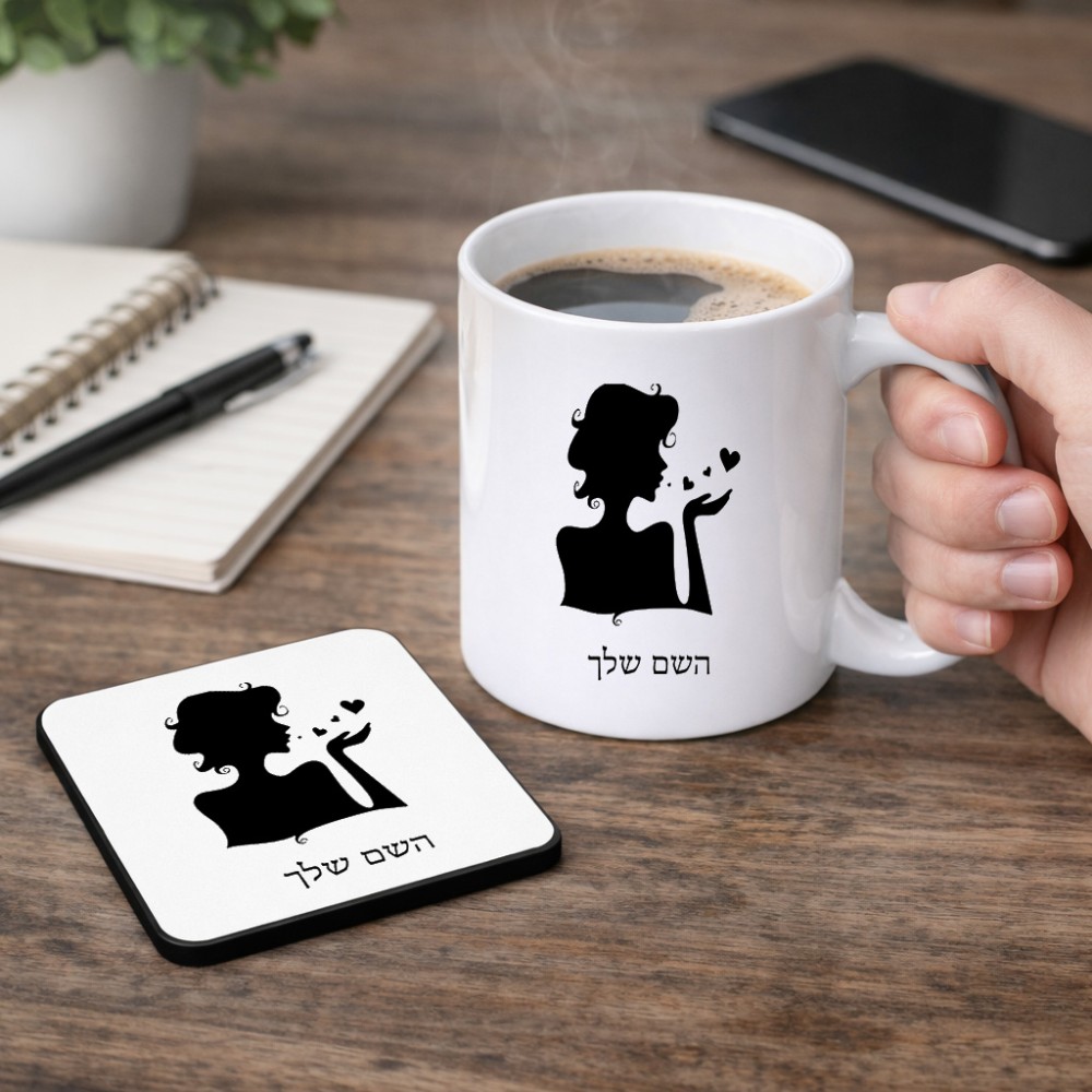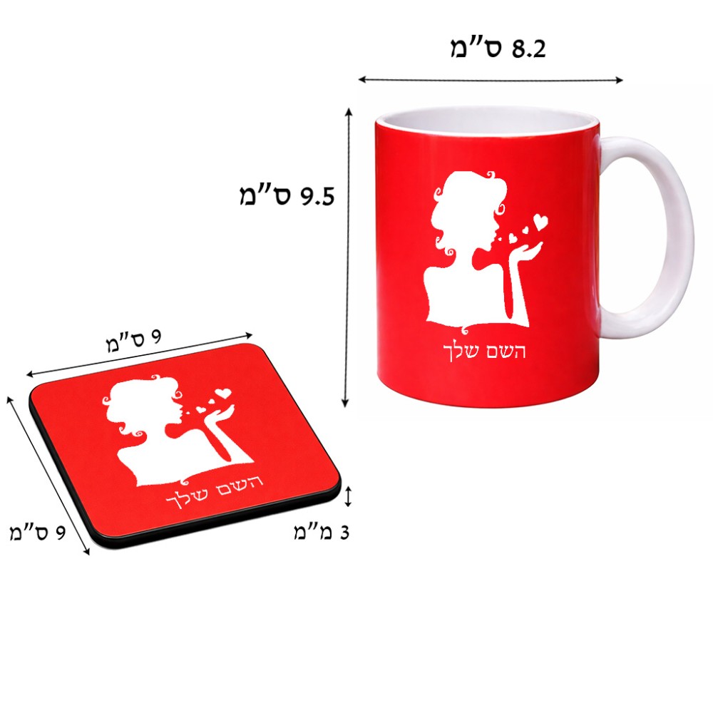 ספל תה \ קפה + תחתית מרובעת בעיצוב אישי עם השם שלך בעיצוב אהבת נשים גודל הספל 325 מ"ל, הספל בעלת ידית לאחיזה יציבה, תחתית מעוצבת בגודל 9 × 9 ס"מ. את השם המבוקש ניתן לציין בהזמנה, אם לא צויין אנחנו ניצור קשר לבירור.