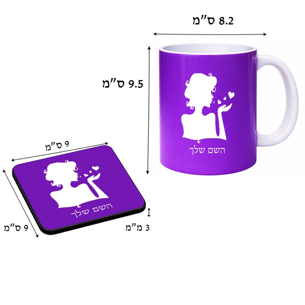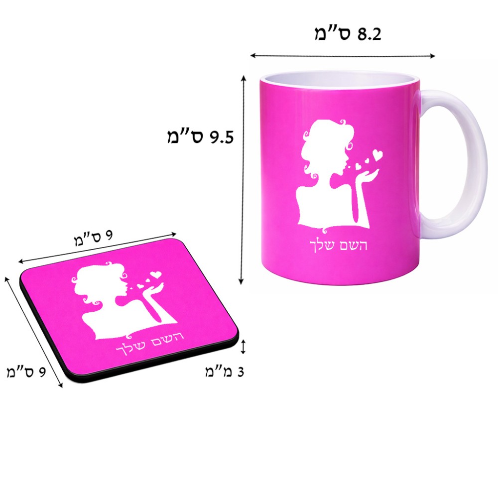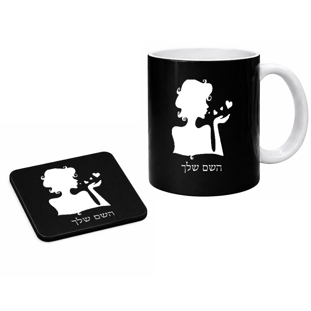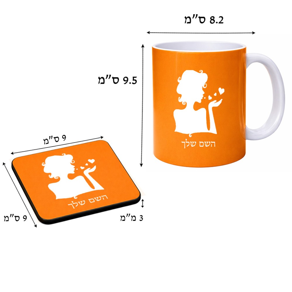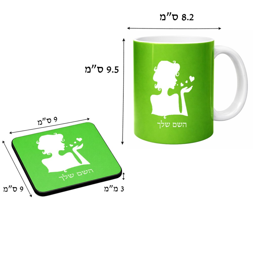 ספל תה \ קפה + תחתית מרובעת בעיצוב אישי עם השם שלך בעיצוב אהבת נשים גודל הספל 325 מ"ל, הספל בעלת ידית לאחיזה יציבה, תחתית מעוצבת בגודל 9 × 9 ס"מ. את השם המבוקש ניתן לציין בהזמנה, אם לא צויין אנחנו ניצור קשר לבירור.