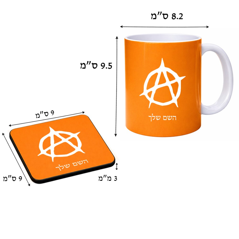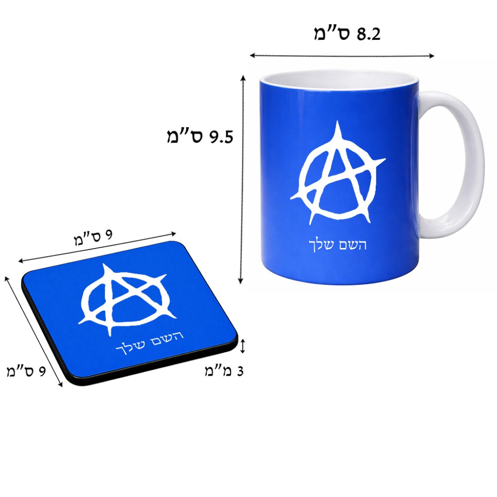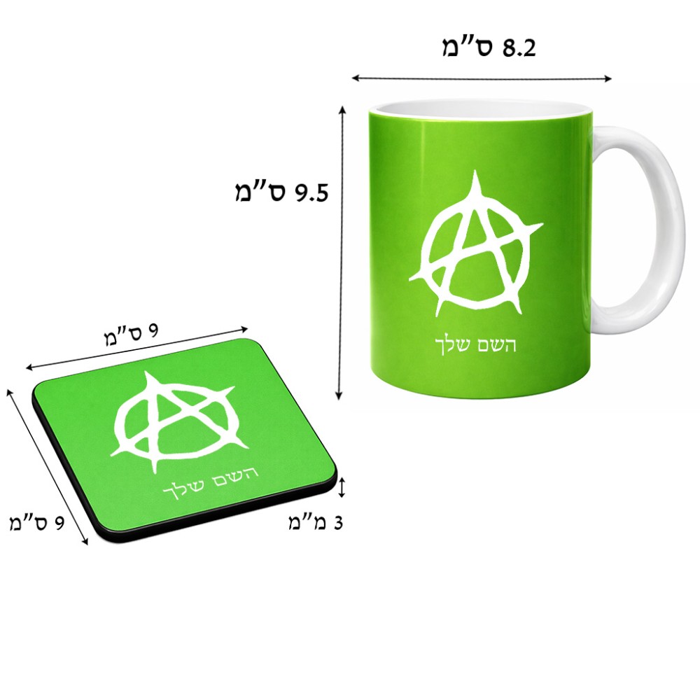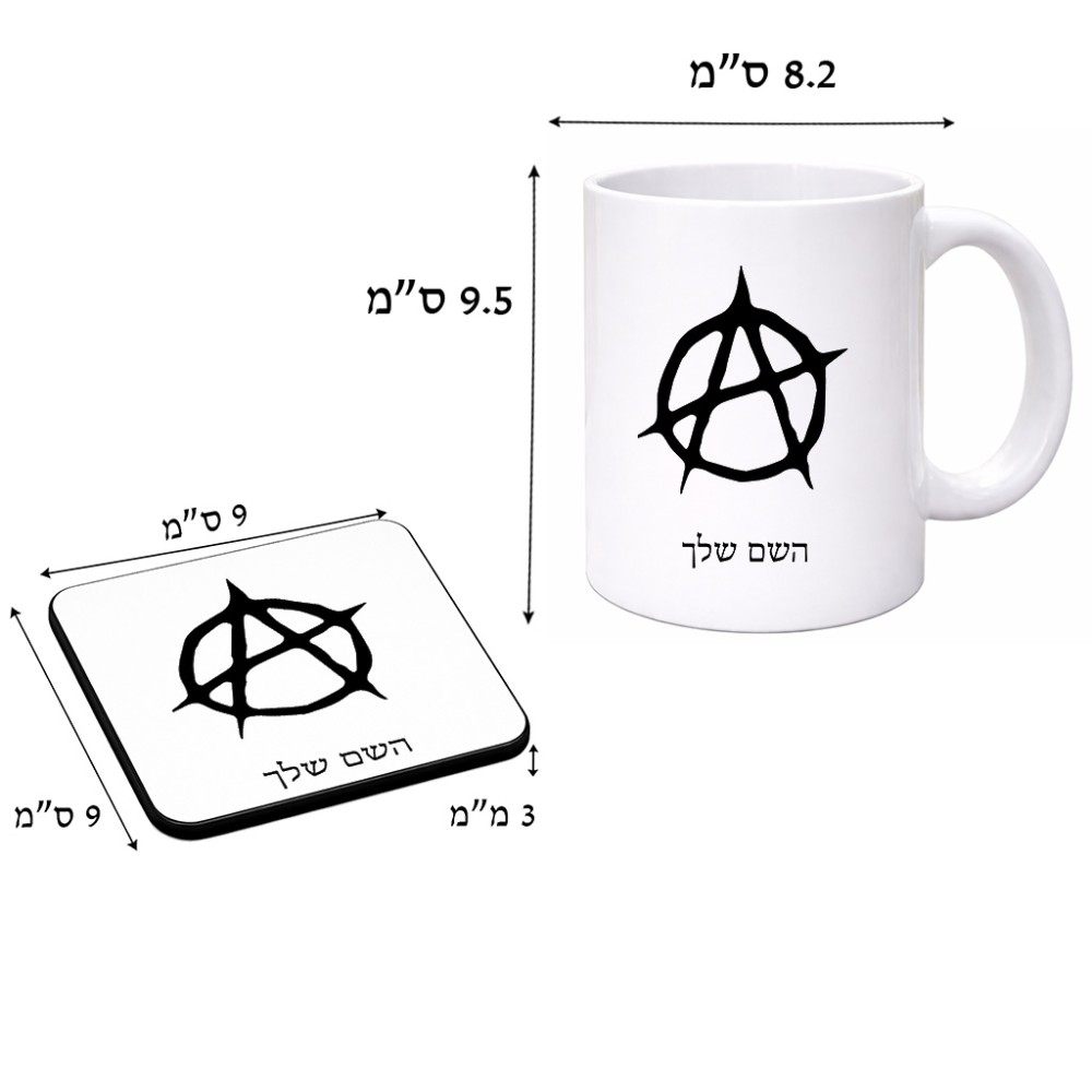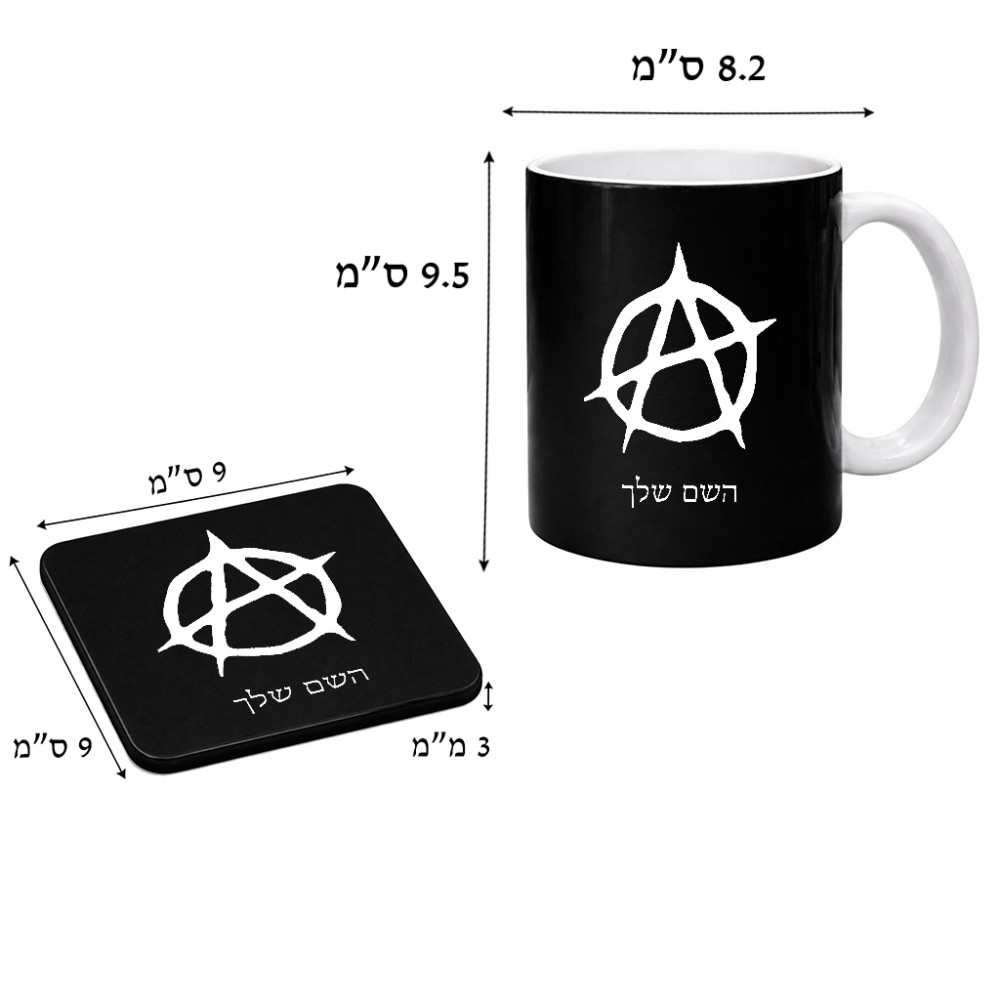 ספל תה \ קפה + תחתית מרובעת בעיצוב אישי עם השם שלך בעיצוב אנרכיה גודל הספל 325 מ"ל גודל התחתית 9 × 9 ס"מ