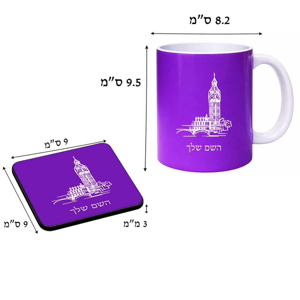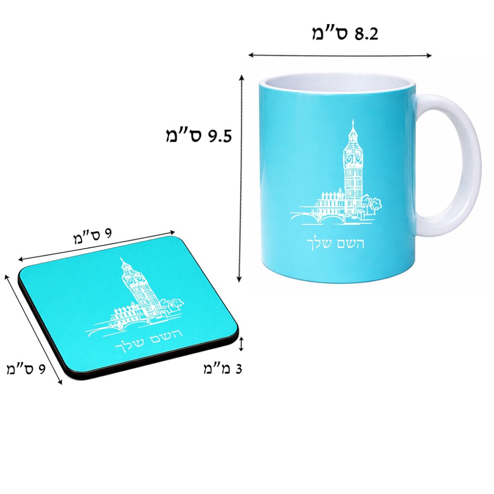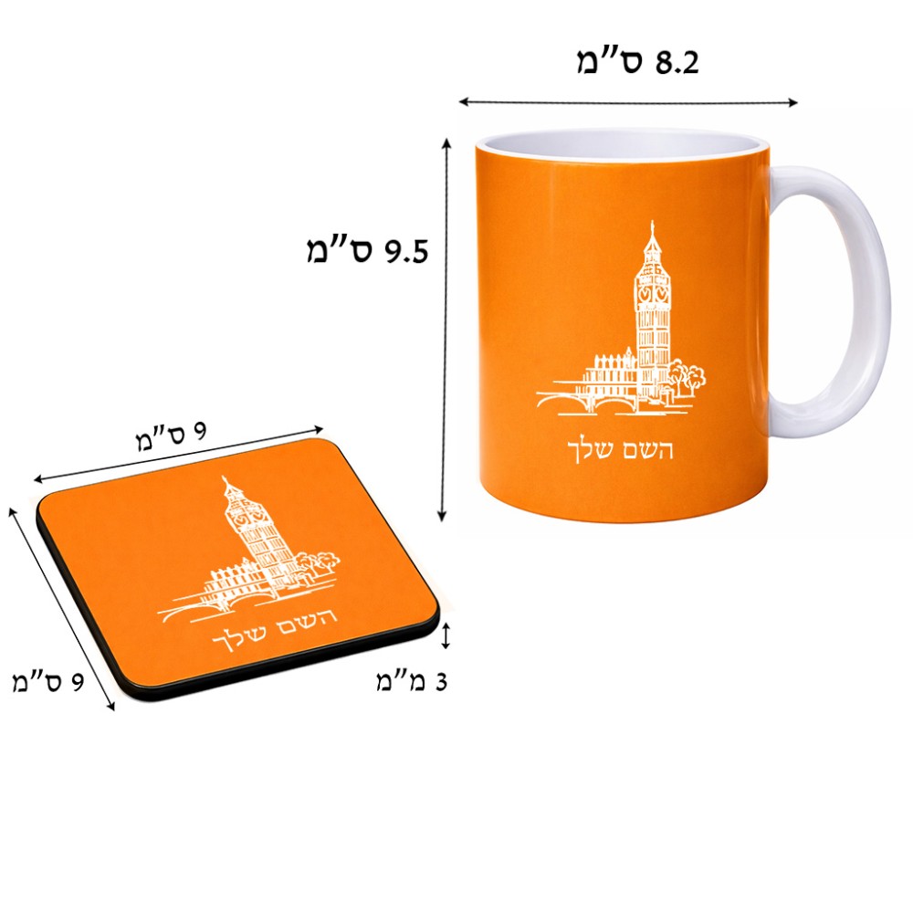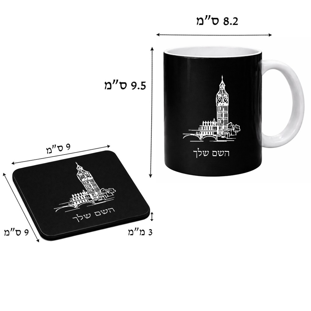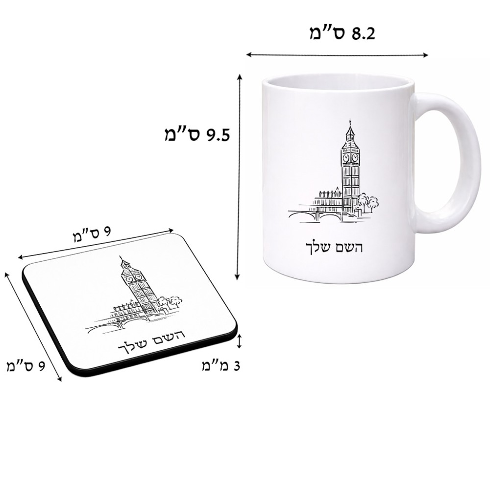 ספל תה \ קפה + תחתית מרובעת בעיצוב אישי עם השם שלך בעיצוב ביג בן גודל הספל 325 מ"ל, הספל בעלת ידית לאחיזה יציבה, תחתית מעוצבת בגודל 9 × 9 ס"מ. את השם המבוקש ניתן לציין בהזמנה, אם לא צויין אנחנו ניצור קשר לבירור.