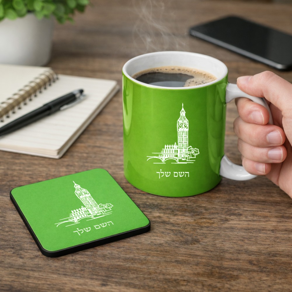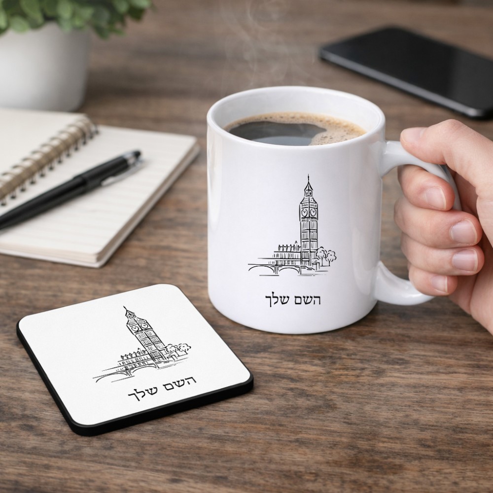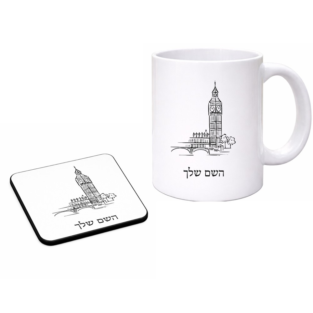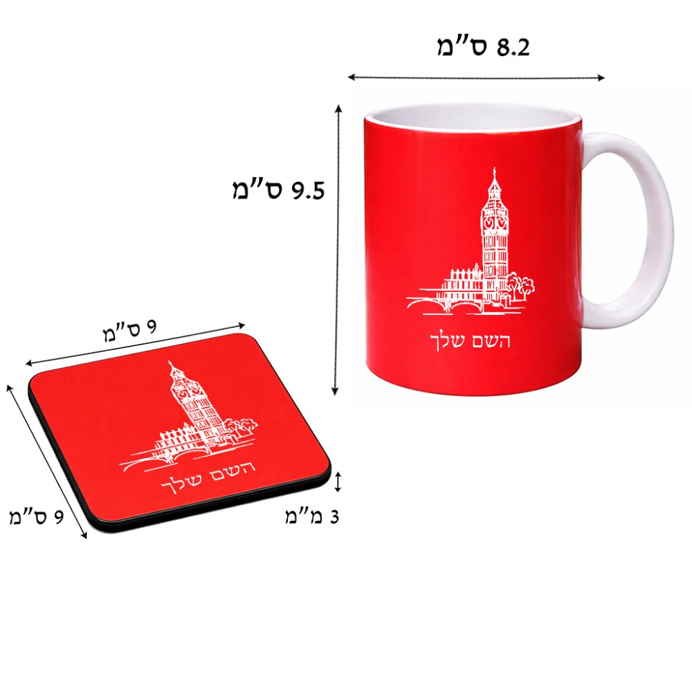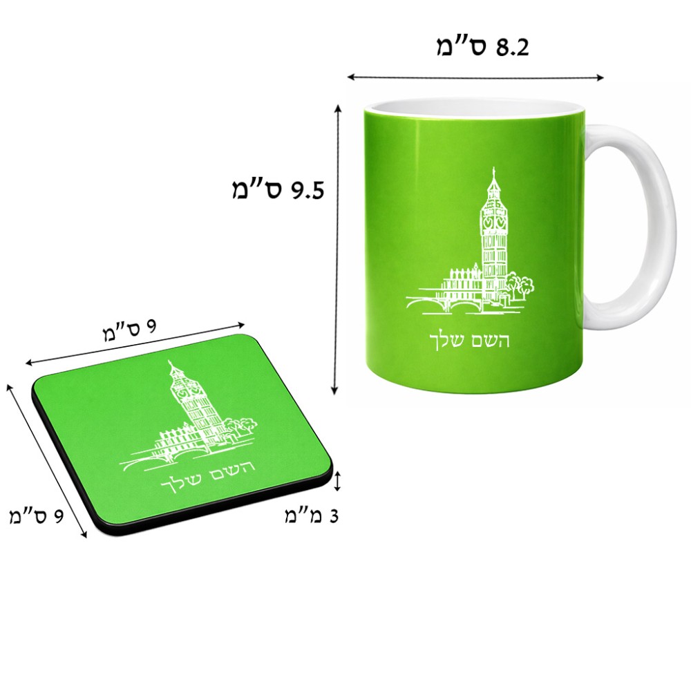 ספל תה \ קפה + תחתית מרובעת בעיצוב אישי עם השם שלך בעיצוב ביג בן גודל הספל 325 מ"ל, הספל בעלת ידית לאחיזה יציבה, תחתית מעוצבת בגודל 9 × 9 ס"מ. את השם המבוקש ניתן לציין בהזמנה, אם לא צויין אנחנו ניצור קשר לבירור.