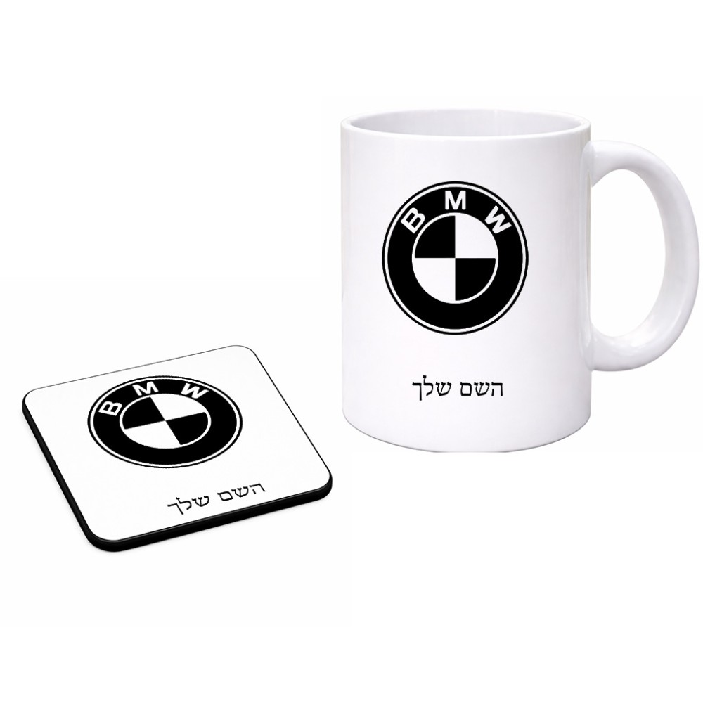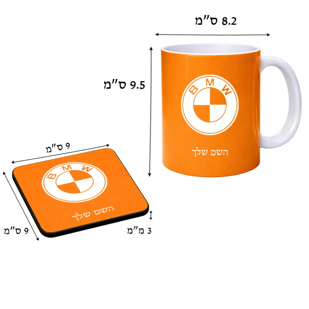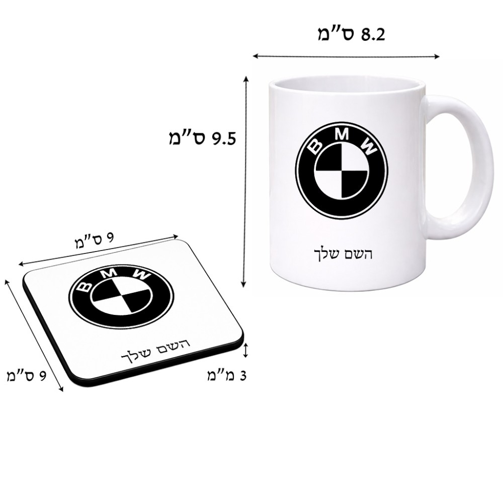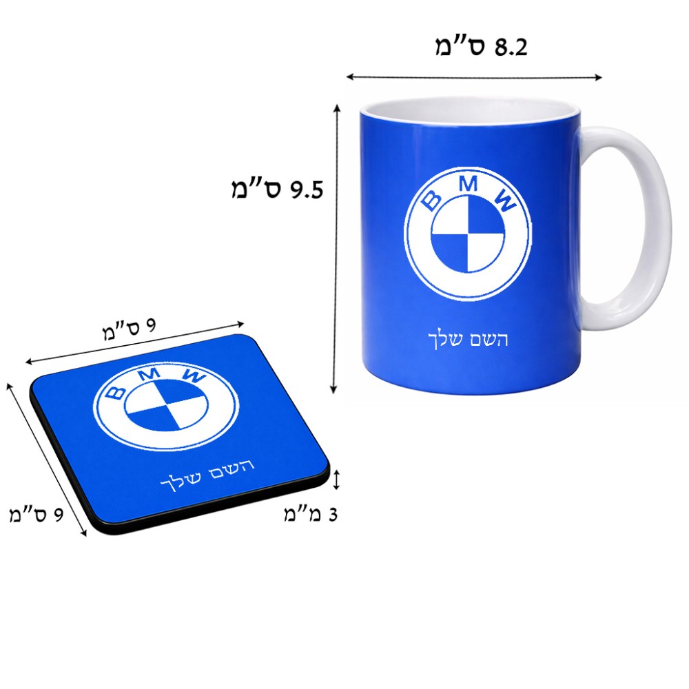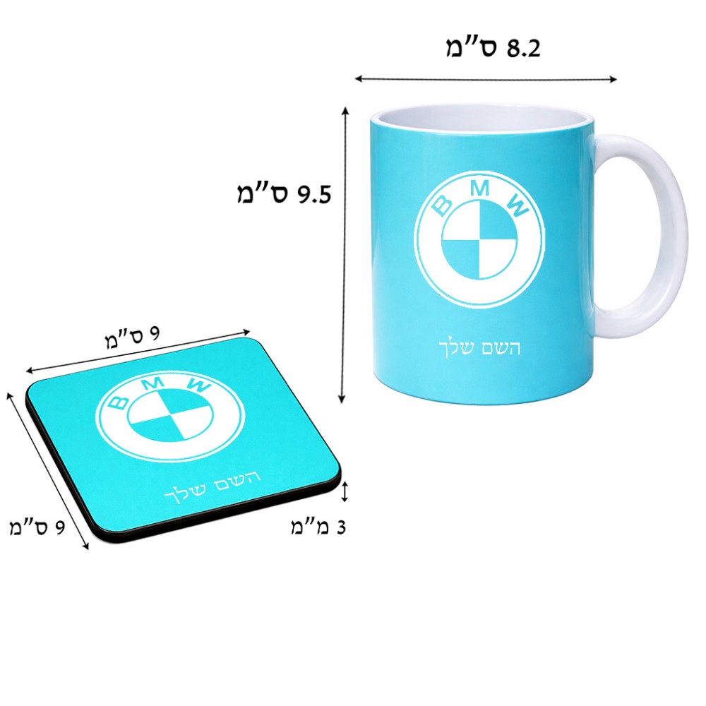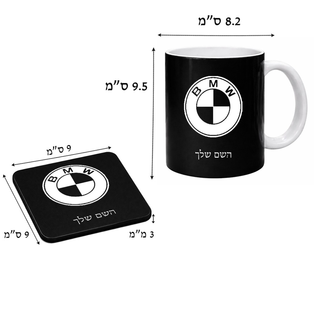 ספל תה \ קפה + תחתית מרובעת בעיצוב אישי עם השם שלך בעיצוב ב.מ.וו גודל הספל 325 מ"ל, הספל בעלת ידית לאחיזה יציבה, תחתית מעוצבת בגודל 9 × 9 ס"מ. את השם המבוקש ניתן לציין בהזמנה, אם לא צויין אנחנו ניצור קשר לבירור.