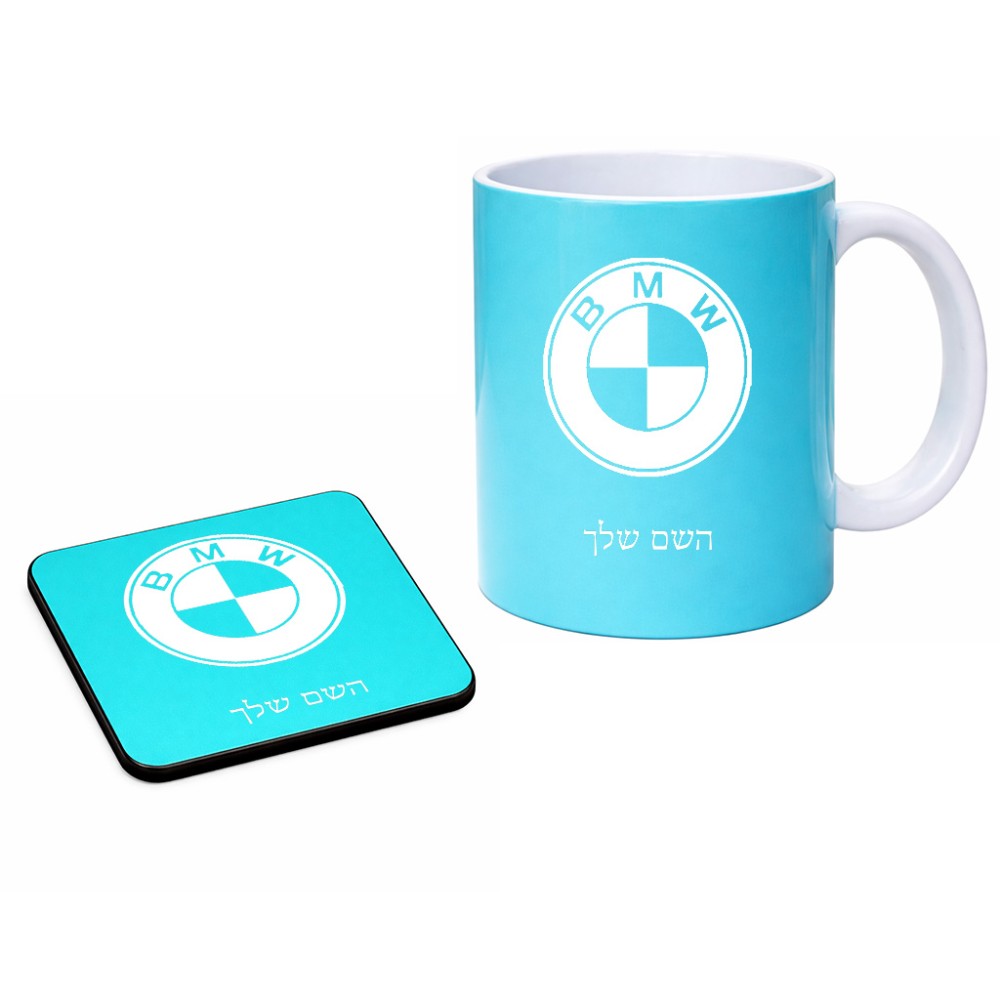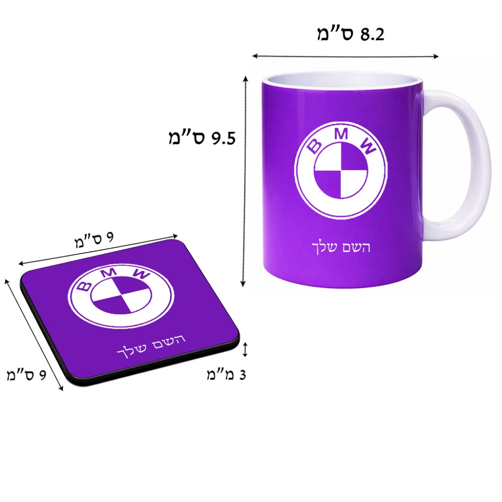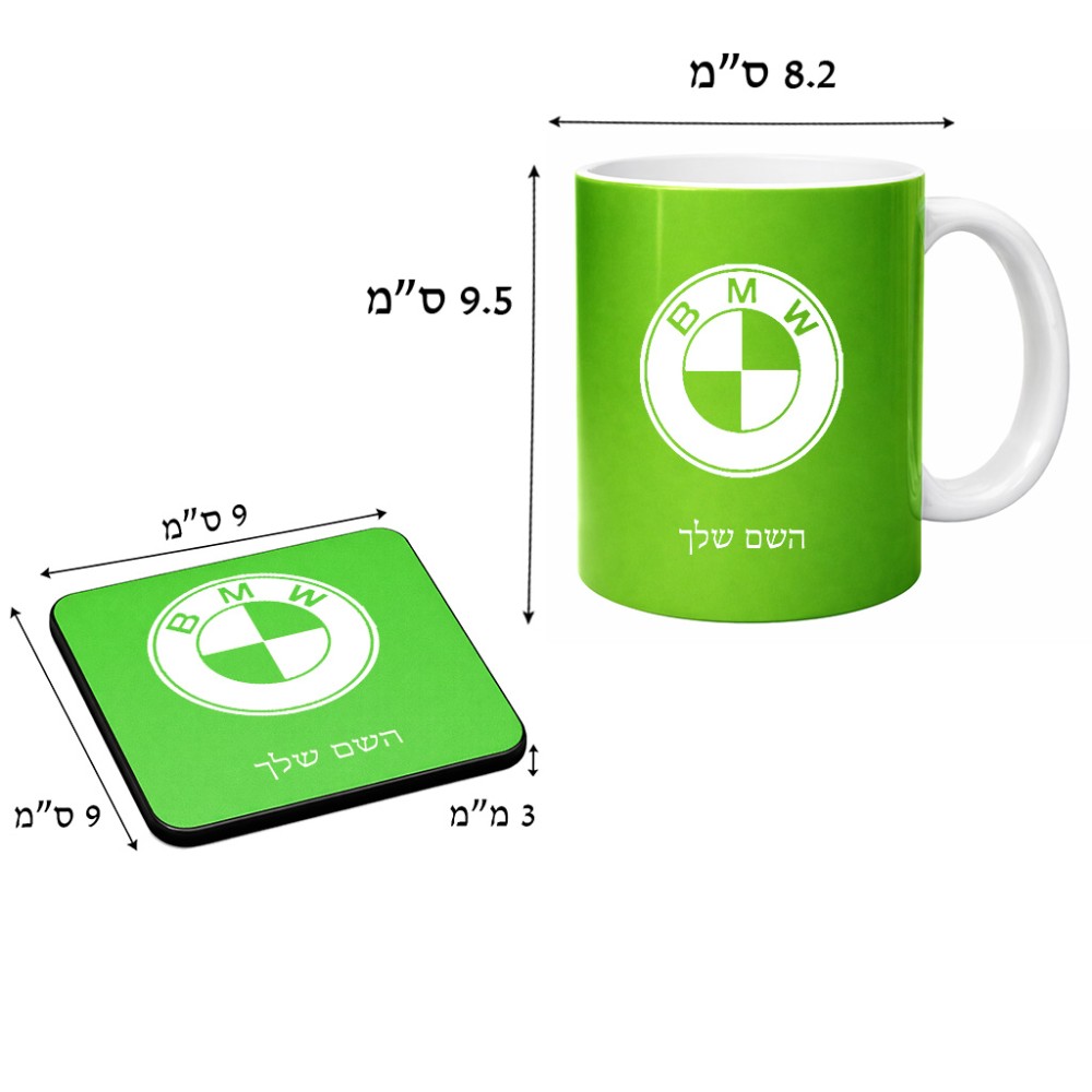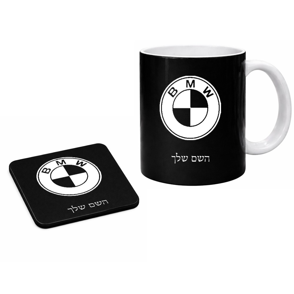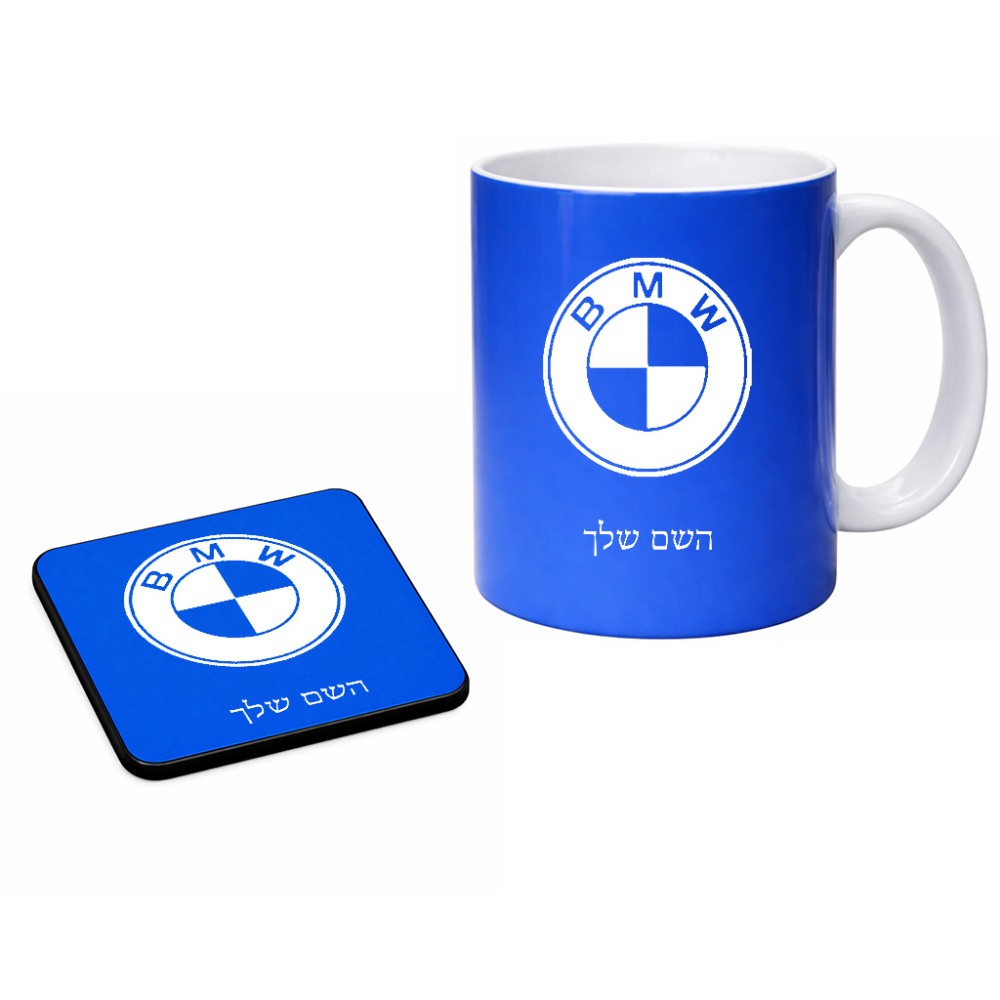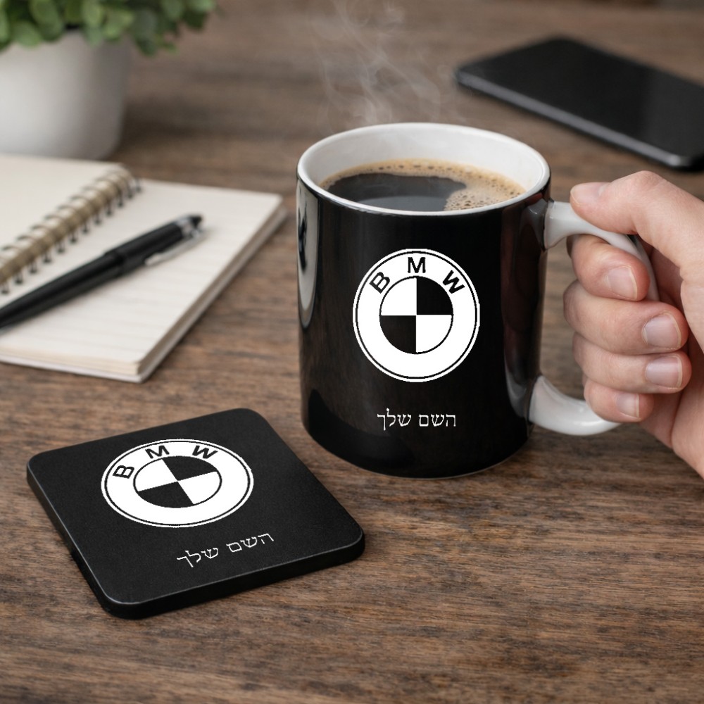ספל תה \ קפה + תחתית מרובעת בעיצוב אישי עם השם שלך בעיצוב ב.מ.וו גודל הספל 325 מ"ל, הספל בעלת ידית לאחיזה יציבה, תחתית מעוצבת בגודל 9 × 9 ס"מ. את השם המבוקש ניתן לציין בהזמנה, אם לא צויין אנחנו ניצור קשר לבירור.