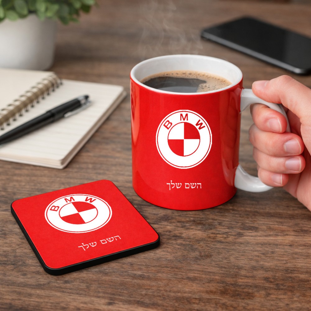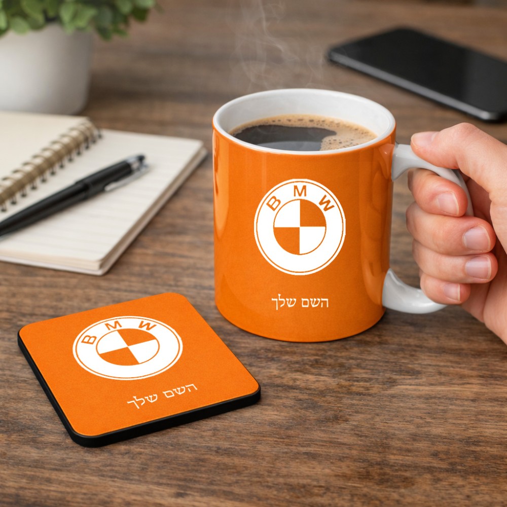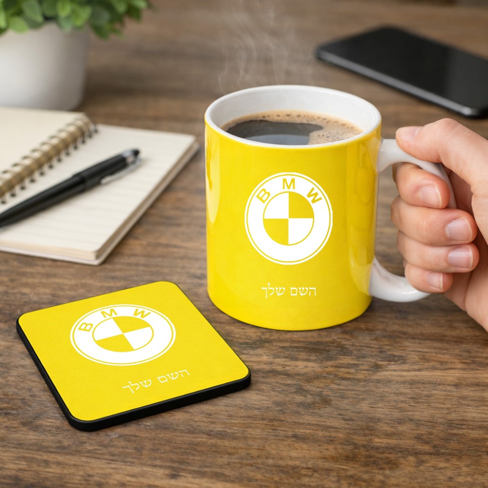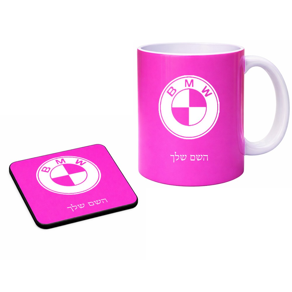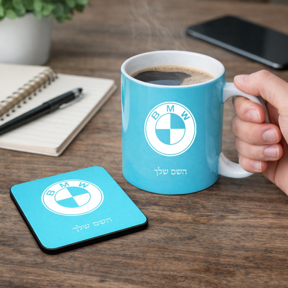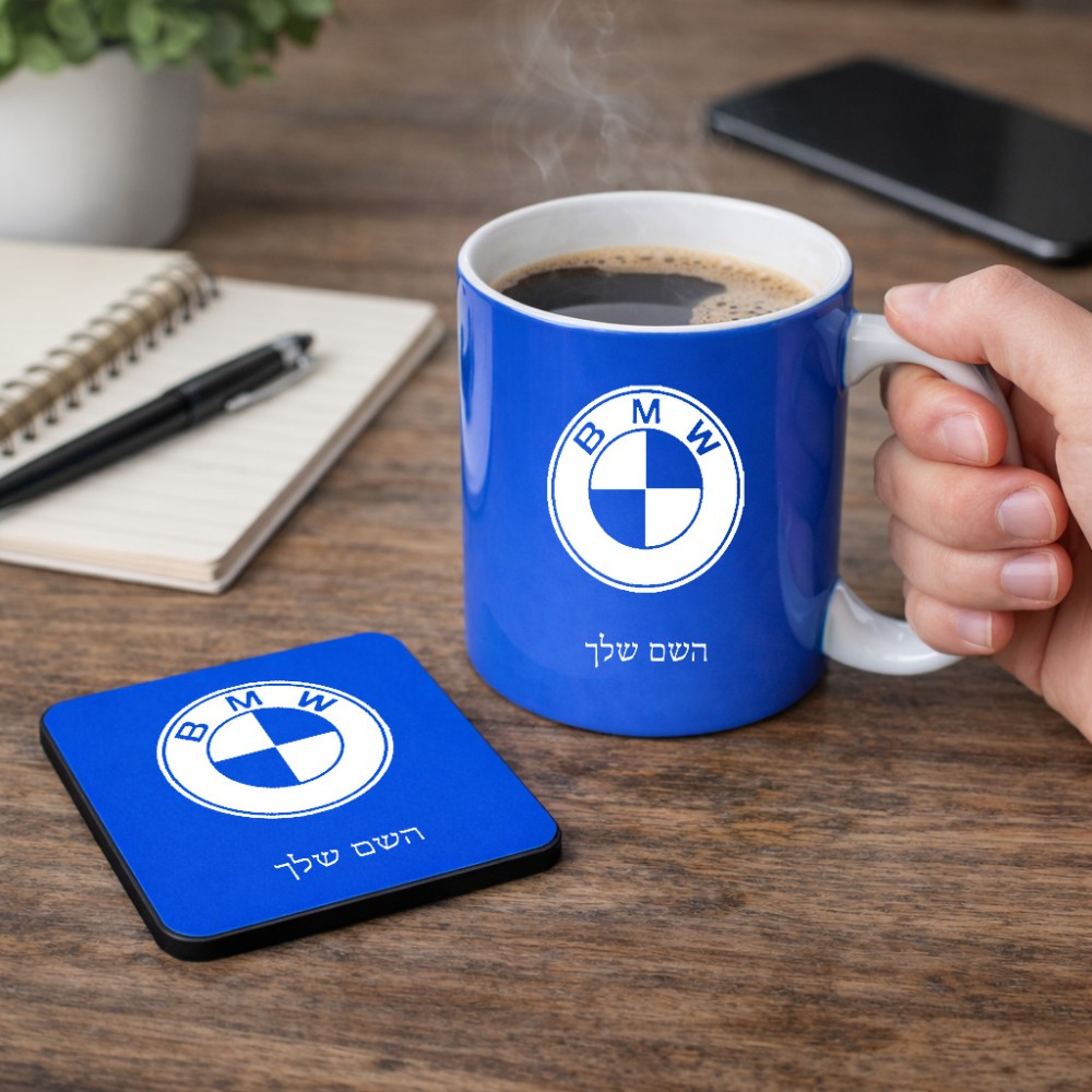 ספל תה \ קפה + תחתית מרובעת בעיצוב אישי עם השם שלך בעיצוב ב.מ.וו גודל הספל 325 מ"ל, הספל בעלת ידית לאחיזה יציבה, תחתית מעוצבת בגודל 9 × 9 ס"מ. את השם המבוקש ניתן לציין בהזמנה, אם לא צויין אנחנו ניצור קשר לבירור.