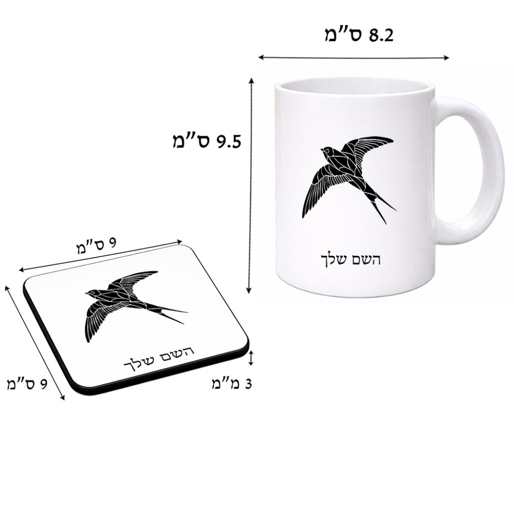 ספל תה \ קפה + תחתית מרובעת בעיצוב אישי עם השם שלך בעיצוב לבלוע גודל הספל 325 מ"ל, הספל בעלת ידית לאחיזה יציבה, תחתית מעוצבת בגודל 9 × 9 ס"מ. את השם המבוקש ניתן לציין בהזמנה, אם לא צויין אנחנו ניצור קשר לבירור.
