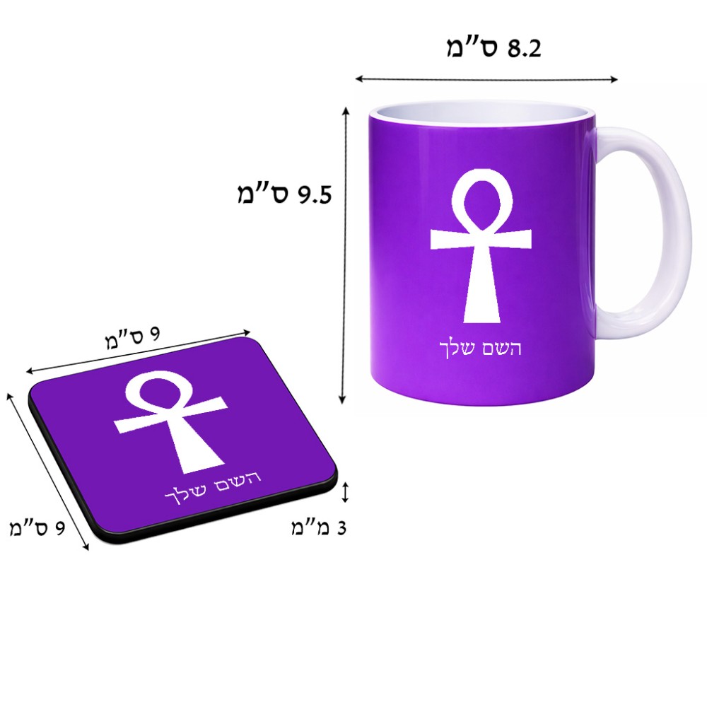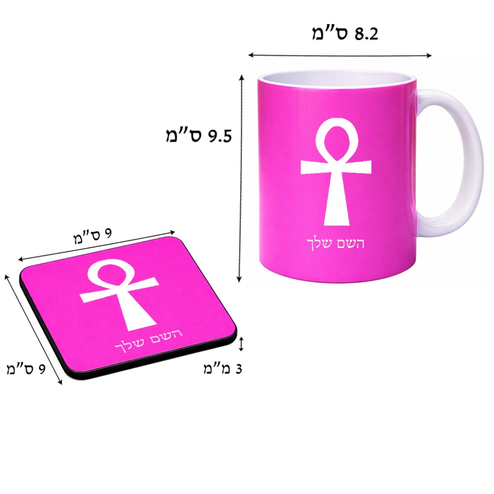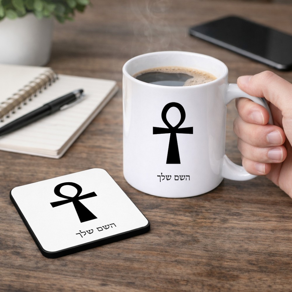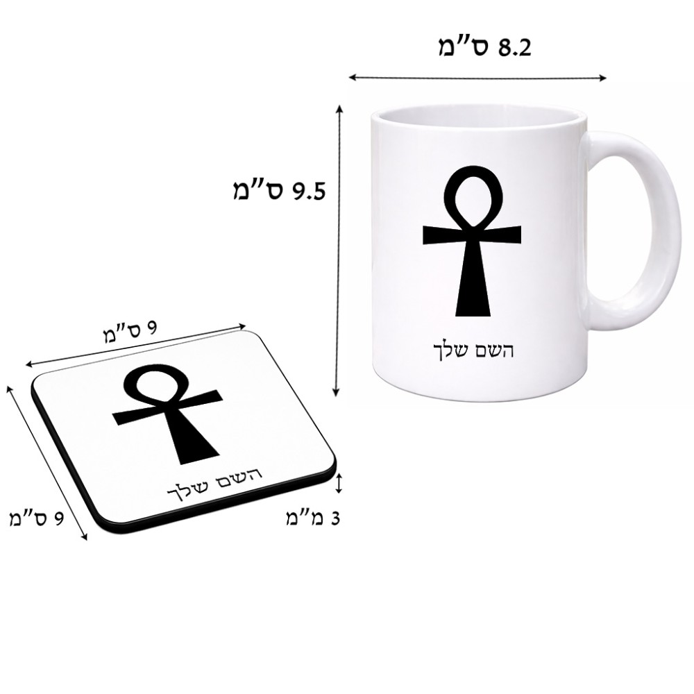 ספל תה \ קפה + תחתית מרובעת בעיצוב אישי עם השם שלך בעיצוב אנק - מפתח החיים המצרי גודל הספל 325 מ"ל גודל התחתית 9 × 9 ס"מ