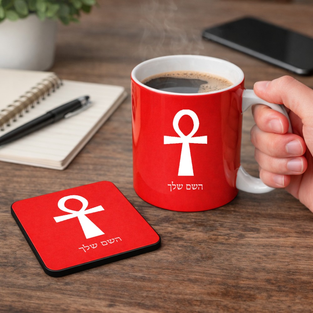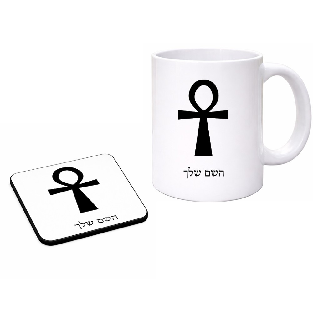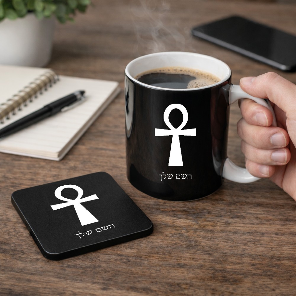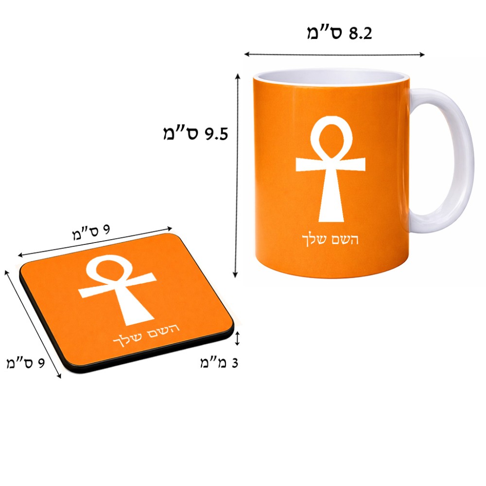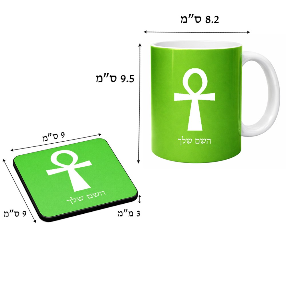 ספל תה \ קפה + תחתית מרובעת בעיצוב אישי עם השם שלך בעיצוב אנק - מפתח החיים המצרי גודל הספל 325 מ"ל גודל התחתית 9 × 9 ס"מ