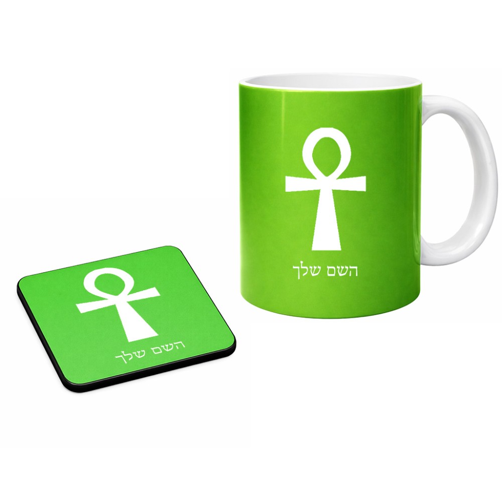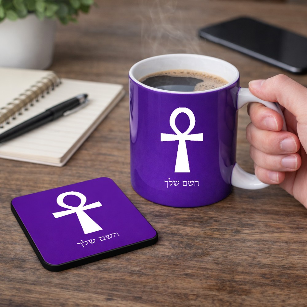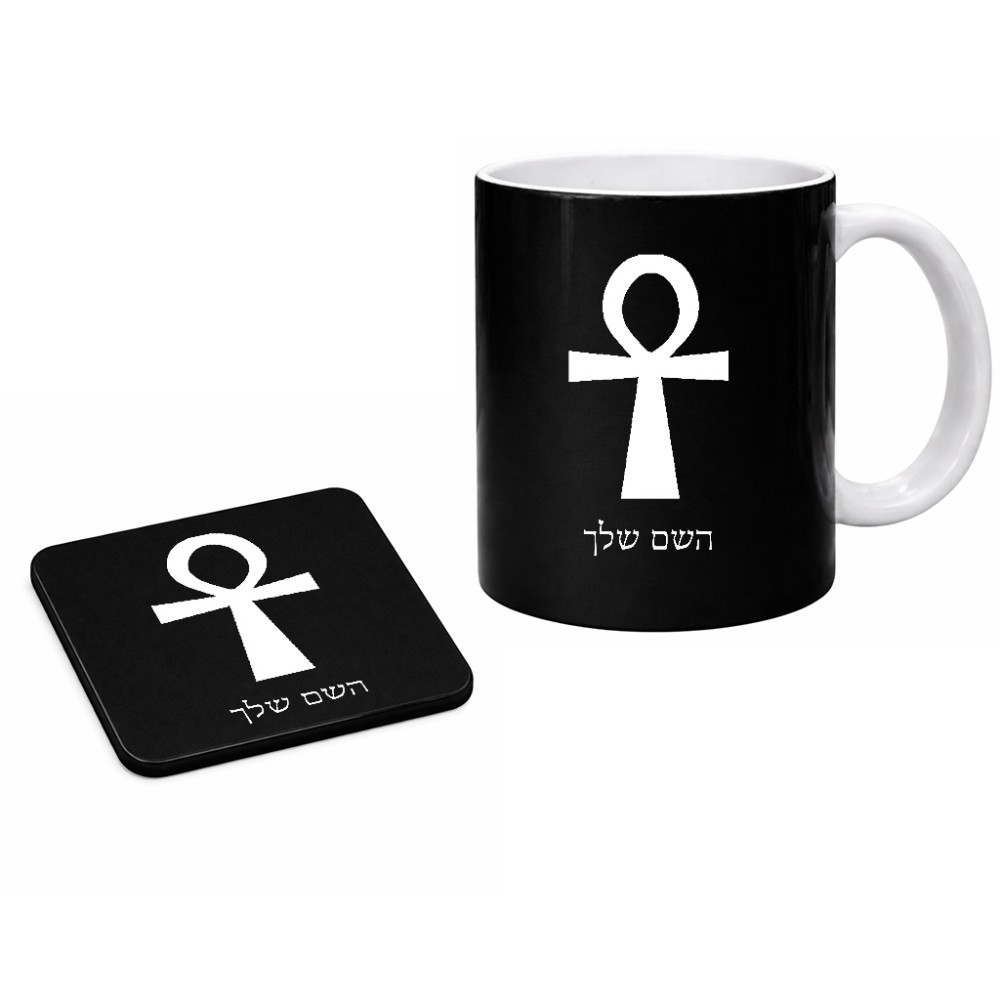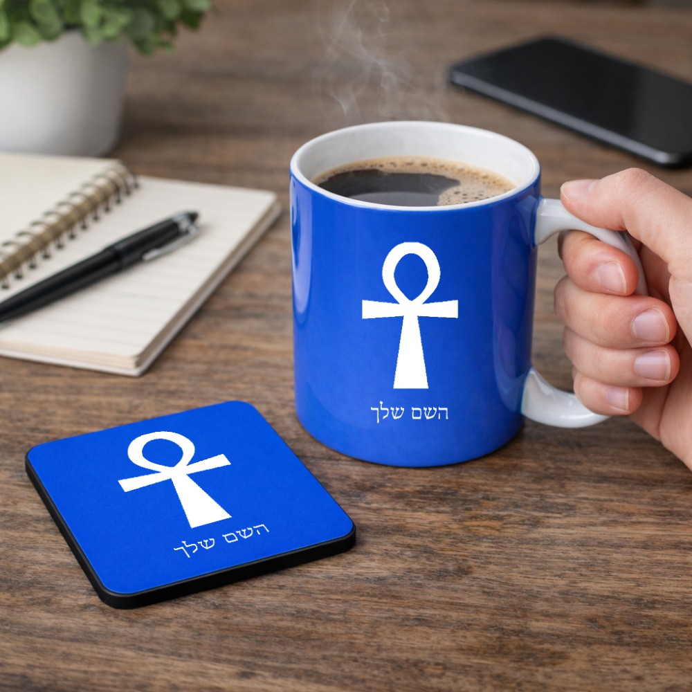 ספל תה \ קפה + תחתית מרובעת בעיצוב אישי עם השם שלך בעיצוב אנק - מפתח החיים המצרי גודל הספל 325 מ"ל גודל התחתית 9 × 9 ס"מ