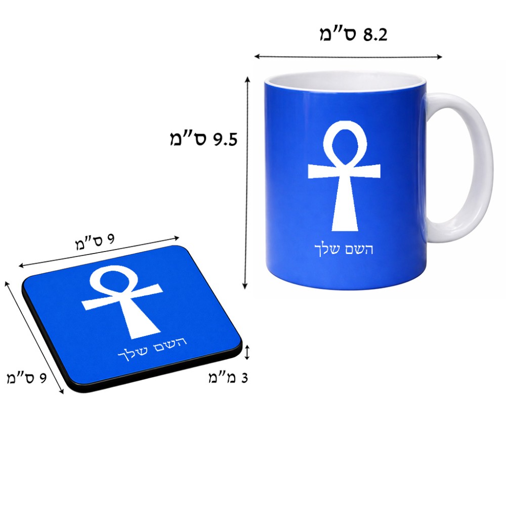 ספל תה \ קפה + תחתית מרובעת בעיצוב אישי עם השם שלך בעיצוב אנק - מפתח החיים המצרי גודל הספל 325 מ"ל, הספל בעלת ידית לאחיזה יציבה, תחתית מעוצבת בגודל 9 × 9 ס"מ. את השם המבוקש ניתן לציין בהזמנה, אם לא צויין אנחנו ניצור קשר לבירור.