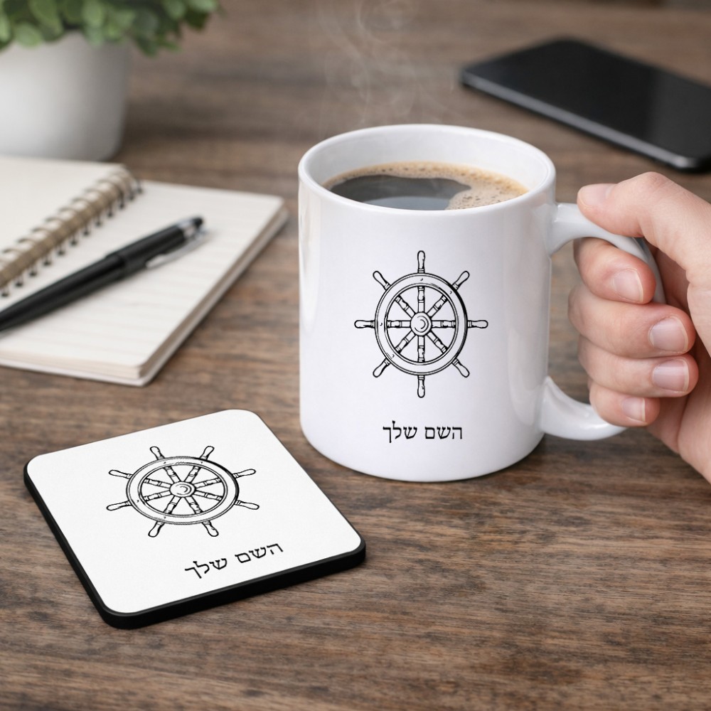 ספל תה \ קפה + תחתית מרובעת בעיצוב אישי עם השם שלך בעיצוב הגה - קפטן - ים גודל הספל 325 מ"ל, הספל בעלת ידית לאחיזה יציבה, תחתית מעוצבת בגודל 9 × 9 ס"מ. את השם המבוקש ניתן לציין בהזמנה, אם לא צויין אנחנו ניצור קשר לבירור.