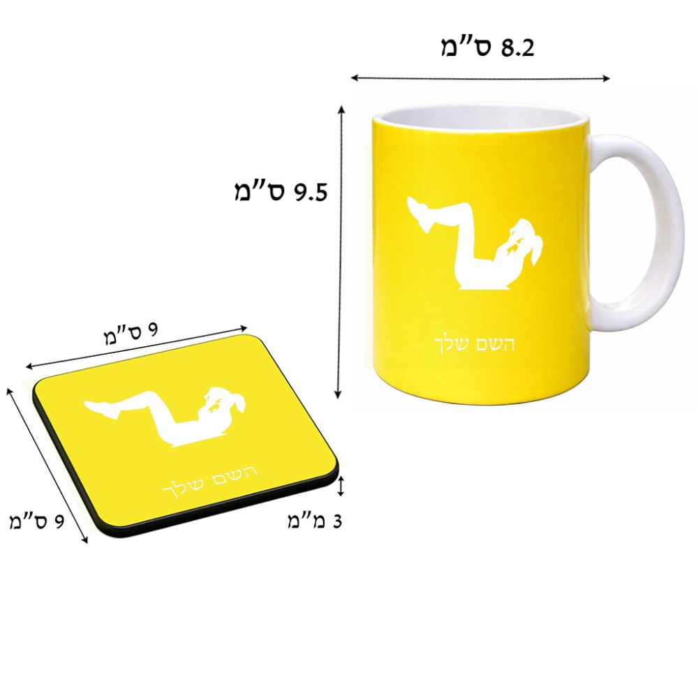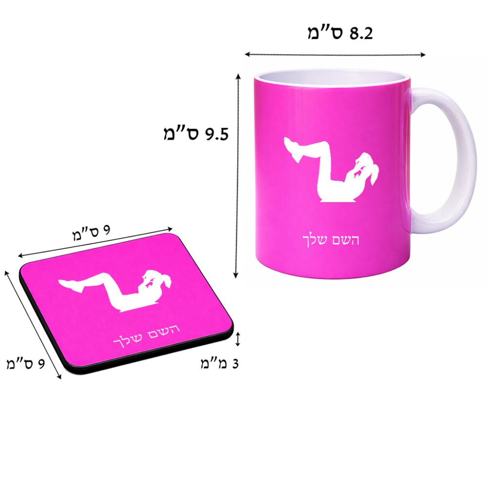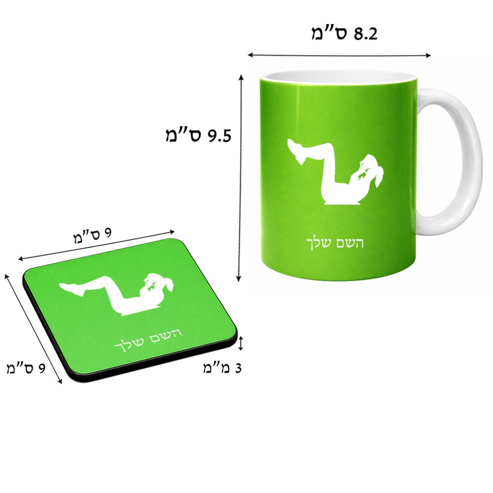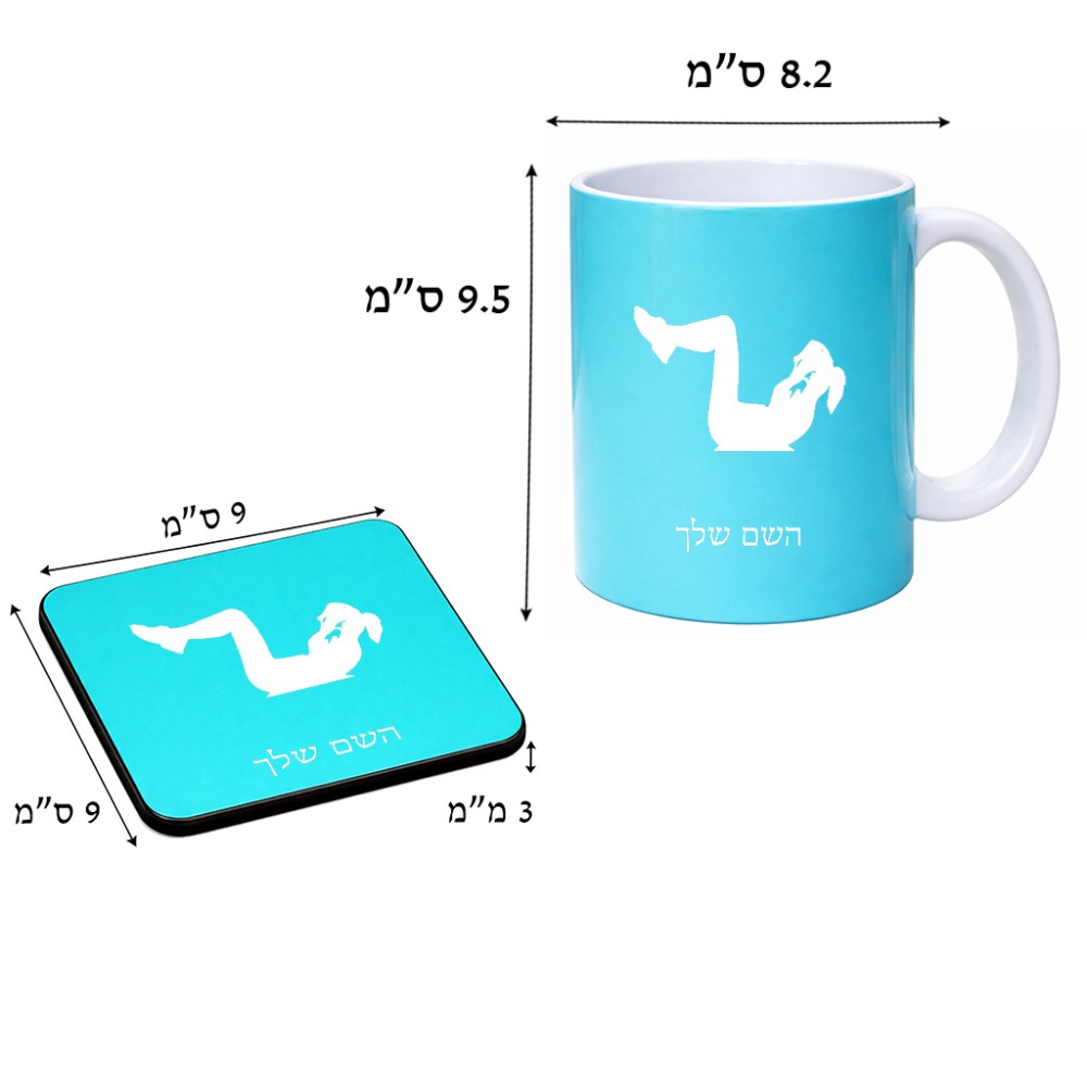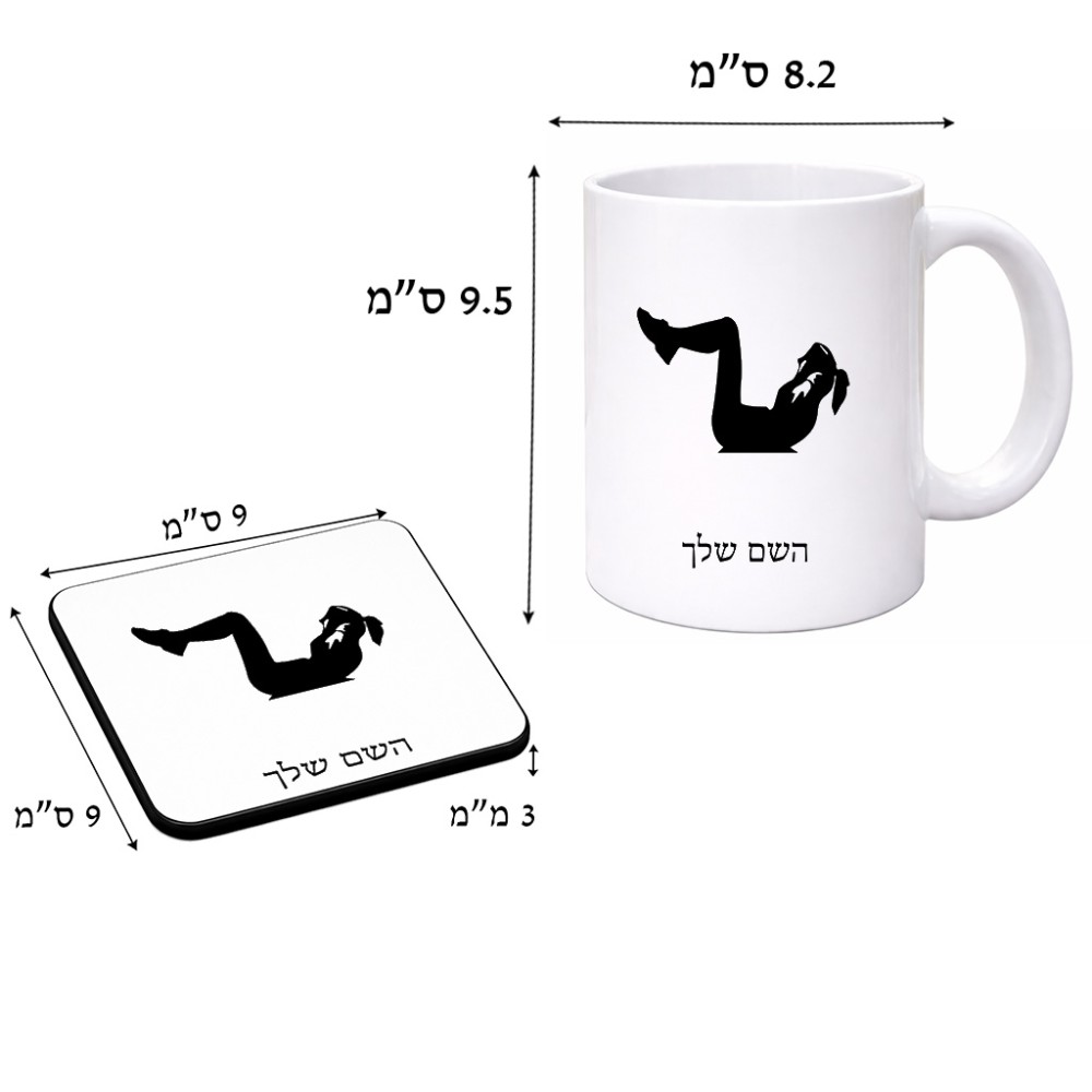 ספל תה \ קפה + תחתית מרובעת בעיצוב אישי עם השם שלך בעיצוב אישה מתאמנת גודל הספל 325 מ"ל, הספל בעלת ידית לאחיזה יציבה, תחתית מעוצבת בגודל 9 × 9 ס"מ. את השם המבוקש ניתן לציין בהזמנה, אם לא צויין אנחנו ניצור קשר לבירור.